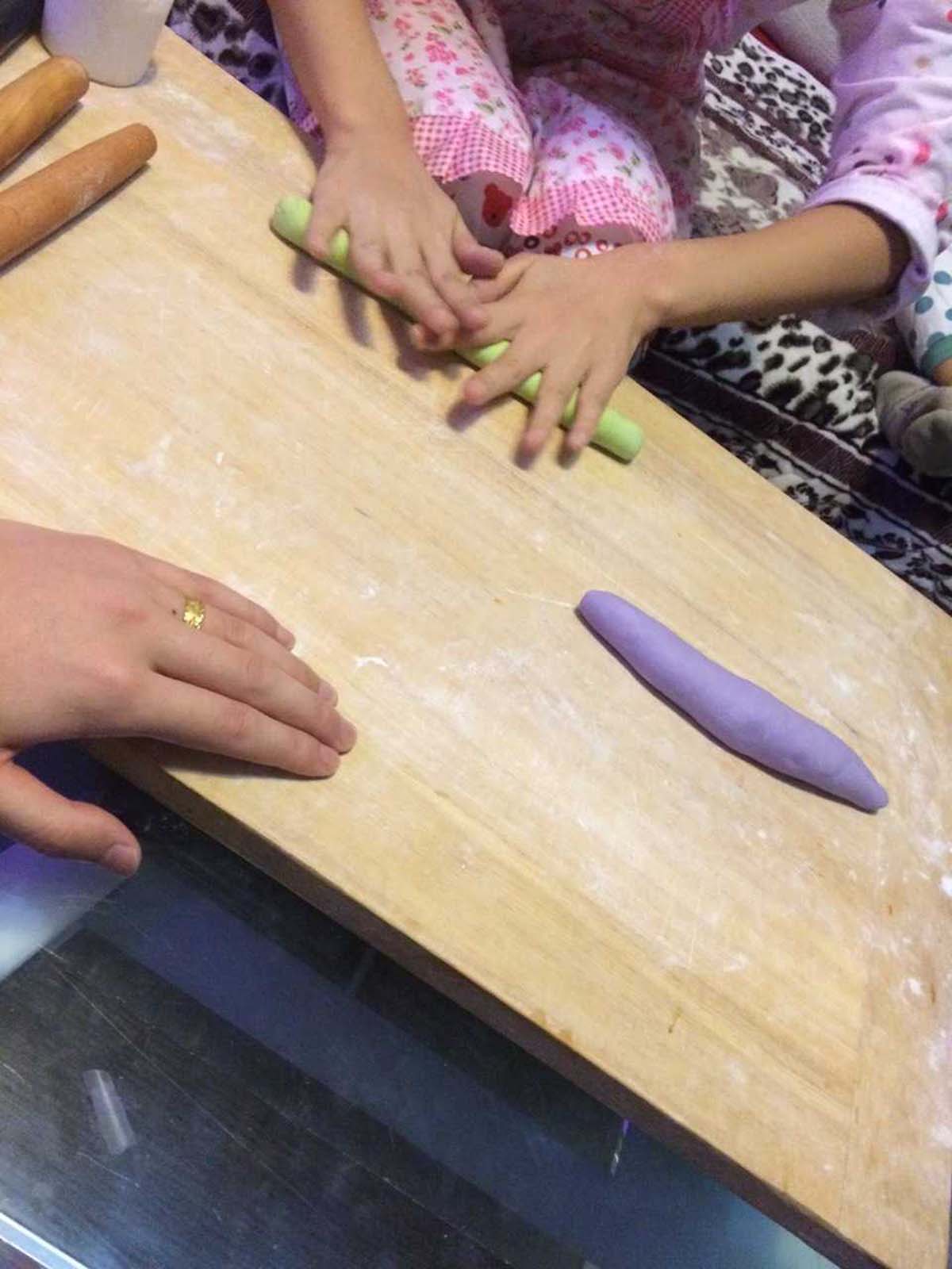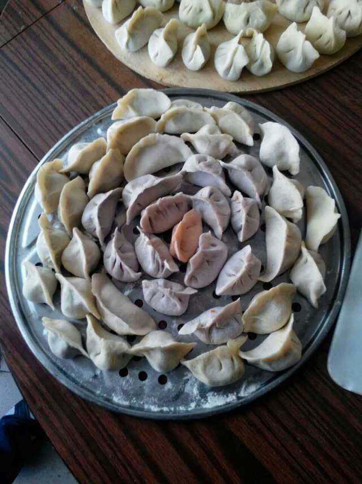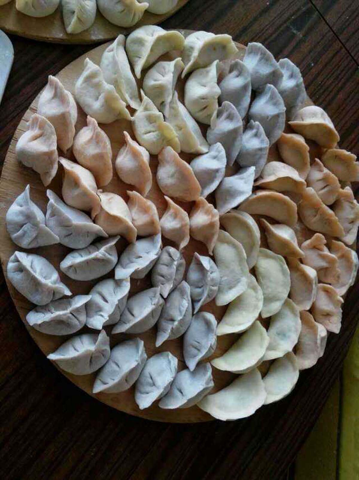 怀着好奇心,我仔细观察,不停地询问,终于找到了答案。原来,颜色主要来自于饺子皮,它是用不同颜色的水和成的,颜色来自于蔬菜,把蔬菜打成汁,用蔬菜汁和面,就颜色各异了。比如绿的,是有青菜汁和的面,紫的是用紫薯汁和的面……