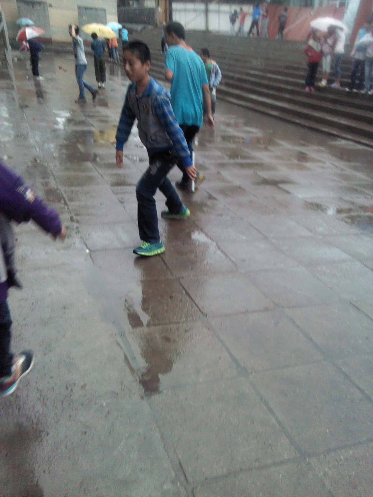 雨中几个男生打着伞,做着各种鬼脸动作。一会儿吐舌头,一会儿挤眼睛,一会儿扭肥腰,样子滑嵇极了。他们也在用这种特殊的方式来表达对雨的喜欢吧。受到男生的影响,女生们好像也疯了,竟然在雨中打起了沙包。