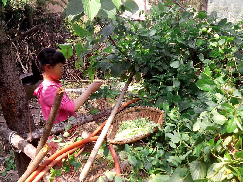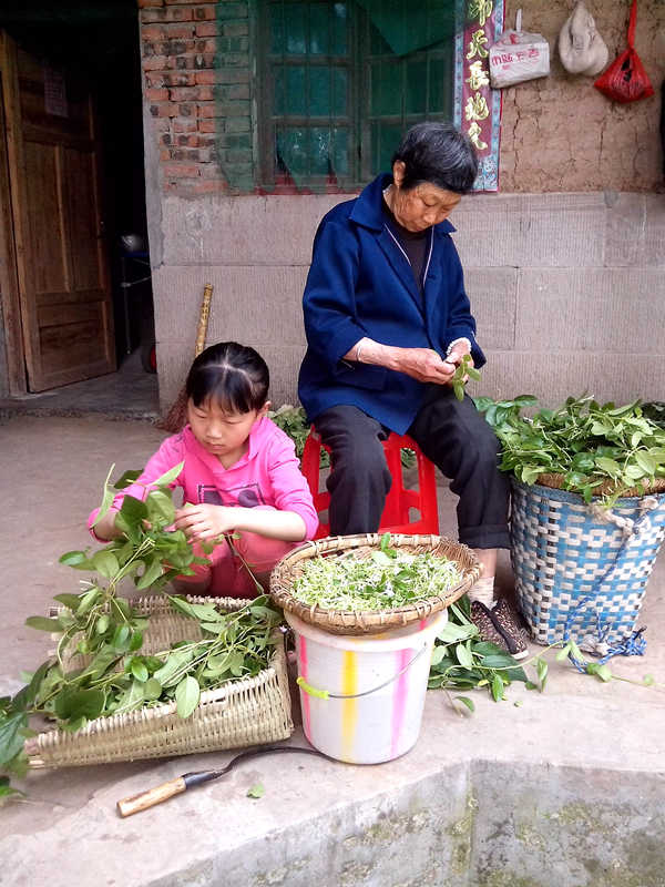 一朵一朵、一点一点地,竹篮的花多起来了,不知不觉太阳照到我的头顶了。五月的太阳虽不如六七月的那么毒,可也烤得我满脸通红。我的手能够够的着的地方都摘完了,可有的花朵确实太高了,好像故意不让我摘它们似的。忙完家务的外婆找来了镰刀,将那些顽固的带花的枝叶割掉,把它们搬到阴凉的地方,这样就可以坐在凳子上摘。在外婆的帮助下,我完成了今年摘金银花的任务。