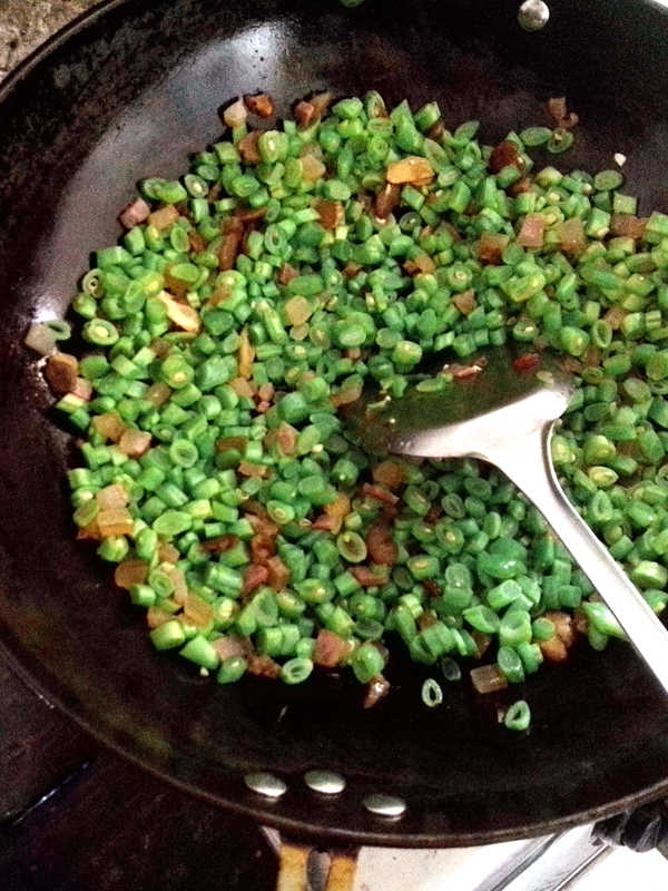 说干就干,先将四季豆捋一下,也就是去掉两头,掐掉菜虫吃掉的部分,再洗干净备用。菜准备好了,我便开始用电饭锅烧水煮饭,同时,我开始把腊肉与菜切碎,我小心翼翼的切,因为一笔小心就会切到手指的。四季豆还简单,可是肉就没有那么轻松了,它们滑滑的非常不听话,费了我九牛二虎之力才把它们全部切碎。一看锅,可以滤饭了,否则米就要被煮化了,而干饭的米要硬一点才好吃的。