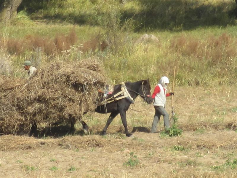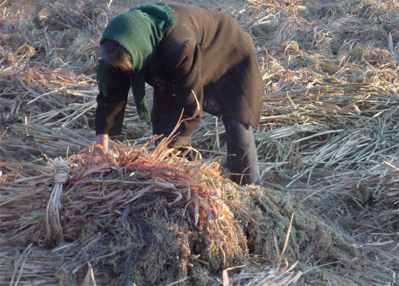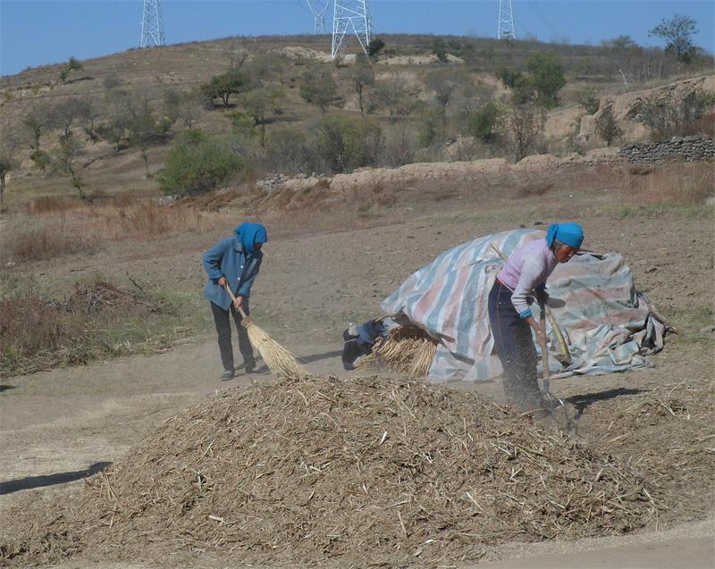 秋天,正是丰收的季节,农家户户都有很多活儿要干,爷爷奶奶忙不过来,所以我们回去帮忙。我们用骡子车把黍子和谷子拉到打谷场上去。先将黍子铺在地上,用骡子拉着一个叫碌碡的大石滚在上面转圈碾压,过了一会儿,爸爸和奶奶把黍子翻过来,又碾压了一会儿,然后用大木叉子把秸秆挑出去。