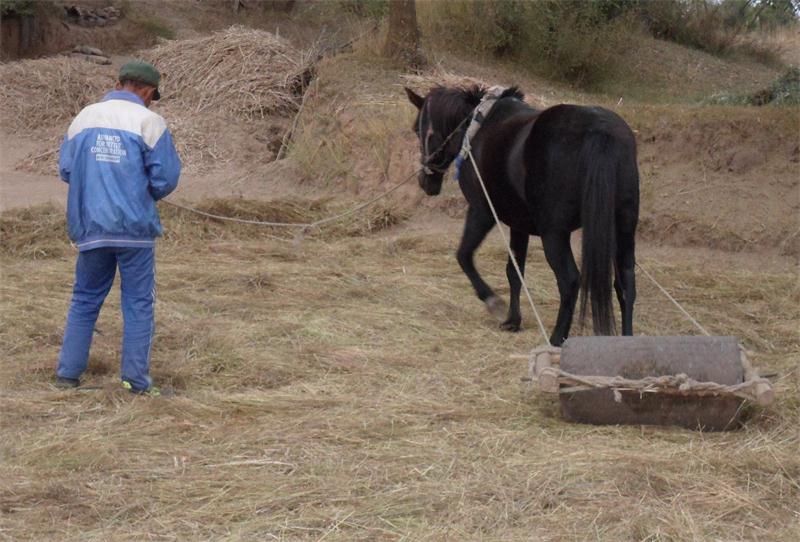 我们用骡子车把黍子和谷子拉到打谷场上去。先将黍子铺在地上,用骡子拉着一个叫碌碡的大石滚在上面转圈碾压,过了一会儿,爸爸和奶奶把黍子翻过来,又碾压了一会儿,然后用大木叉子把秸秆挑出去。