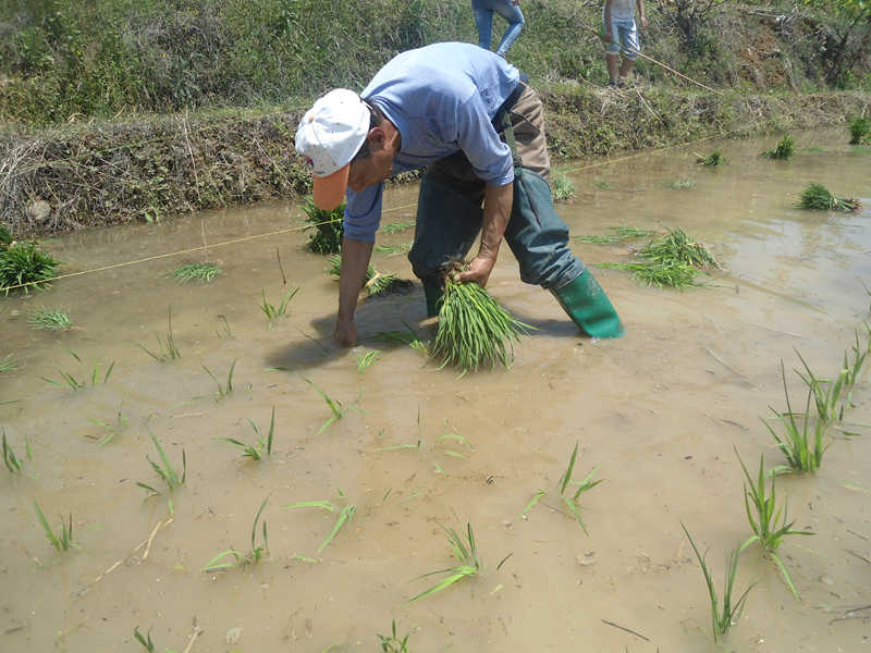 外公早已栽好了标秧,水田里整齐地排列着间距相同的秧,我们先把秧隔上几步扔一个进入水田里,这样下去栽的时候就能方便地取秧了。下田以后,我们一人分了一块,开始插秧。大家都低着头、弯着腰,从解开的小捆中取出秧苗,不停地往水里栽,熟练得如蜻蜓点水般……随着一步步的后退,脚下的水田里出现了一片片绿意。