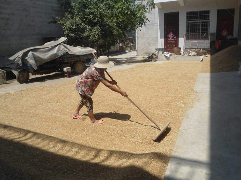 中午爷爷将收回来的麦子倒在地上,奶奶再用木耙将它们均匀的搅开,晒在院子里,我只负责翻搅、收。搅麦子很简单,晒一会儿,用木耙把麦子搅一遍就行了,每次朝相反的方向搅,这样可以让麦子充分见到阳光。