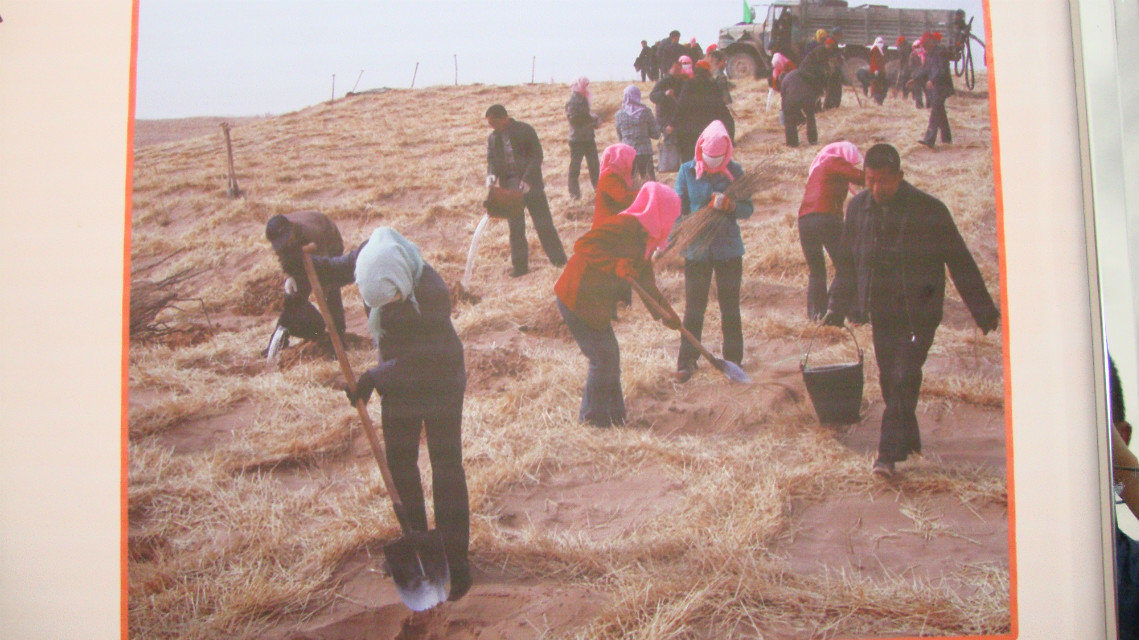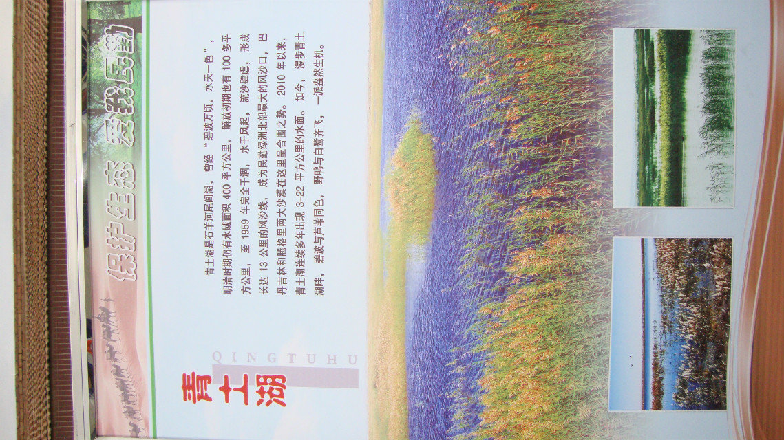 宣传展板显示:青土湖曾是民勤境内最大的湖泊,后因绿洲内地表水急剧减少,地下水位大幅下降,完全干涸沙化,腾格里和巴丹吉林两大沙漠在此合拢。流沙以每年8-10米的速度向绿洲逼进,严重威胁了邻近乡镇的人居环境,造成了"沙进人退"的局面。有的人家甚至举家搬迁, 青土湖如今也名存实亡。