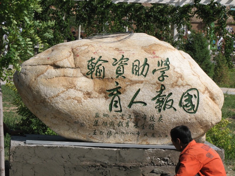 这块秦岭石是由焦旭鼎先生(盐池二中86届校友)在陕西省西安精心选购的,特意邀请宁夏回族自治区政府主席王正伟同志题词, "输资助学"是焦旭鼎先生热心公益事业,关心家乡教育拳拳深情的自然表达,是对盐池教育事业发展的支持和鼓舞。"育人报国"是焦旭鼎先生希望实现的愿景,是对家乡学子的鞭策与激励。尤其是王正伟主席能亲笔题词,显示出他对焦旭鼎教育基金的褒奖,也是对盐池二中的莫大鼓舞。