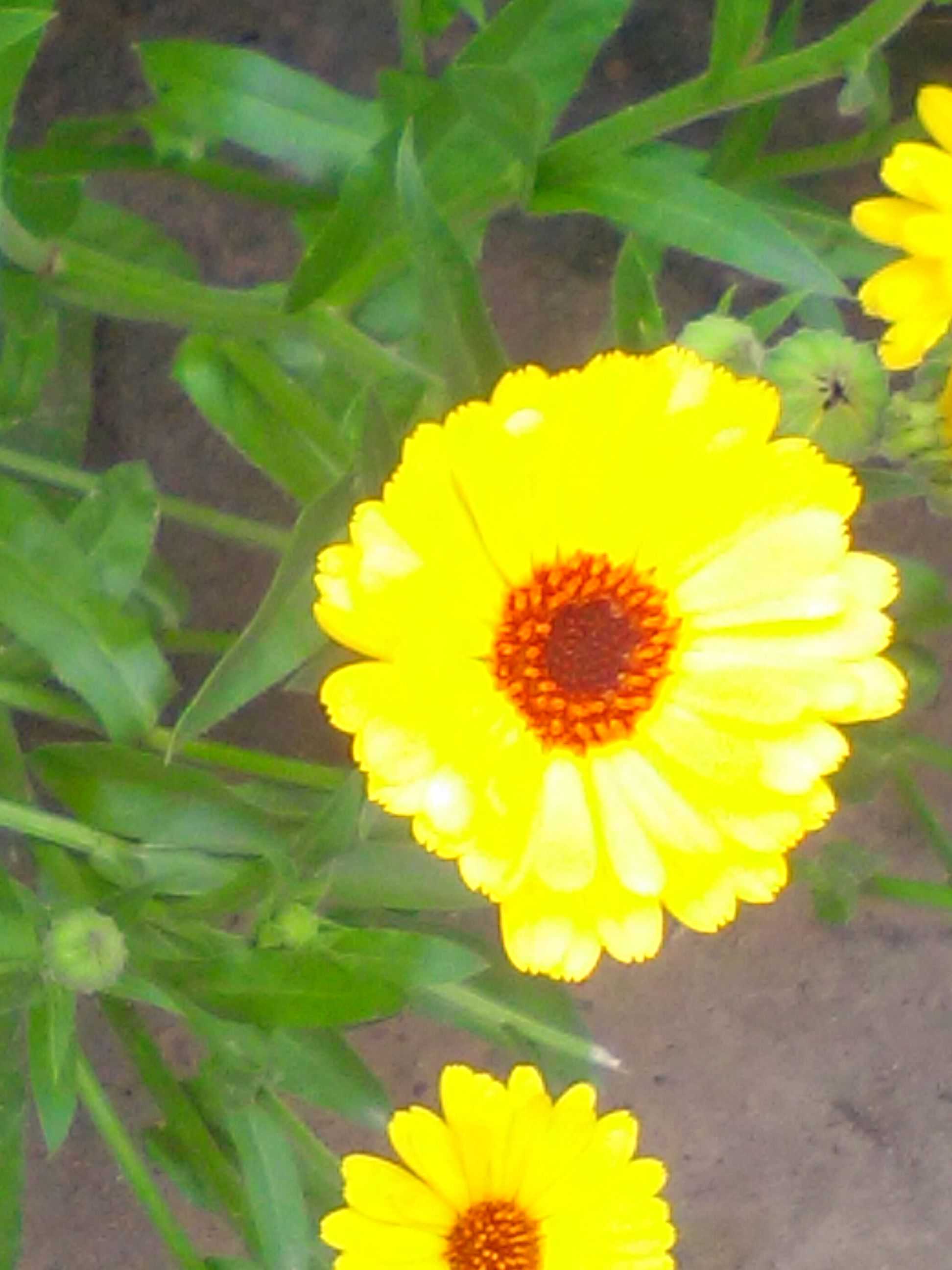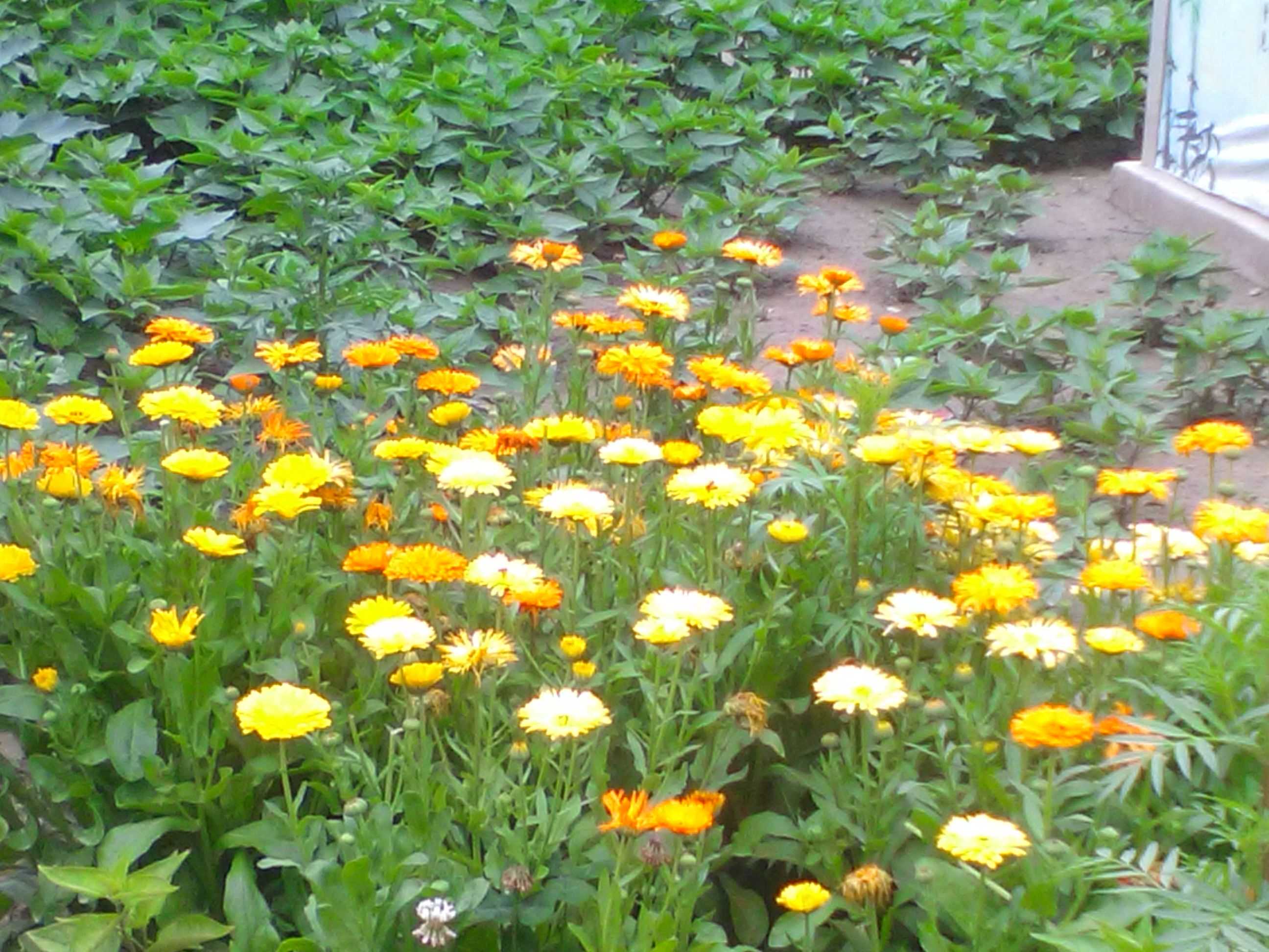 在茂密的花丛中,有数不清的含苞待放的花骨朵,更多的是争先恐后开放的花儿。一阵风轻轻的吹过来,带来了无尽的芬芳,蜜蜂们在花朵上忙碌着。看:金盏菊犹如一个个"小太阳",它们金黄的花瓣由一片片又细又长的小花瓣,一圈一圈的围成,在"小太阳"的中心,更小的花儿密密的在中间开放,金色的"小太阳"镶嵌在绿油油的绿叶中,金色的花瓣,如同太阳洒出的万道金光,显得那么生气勃勃。