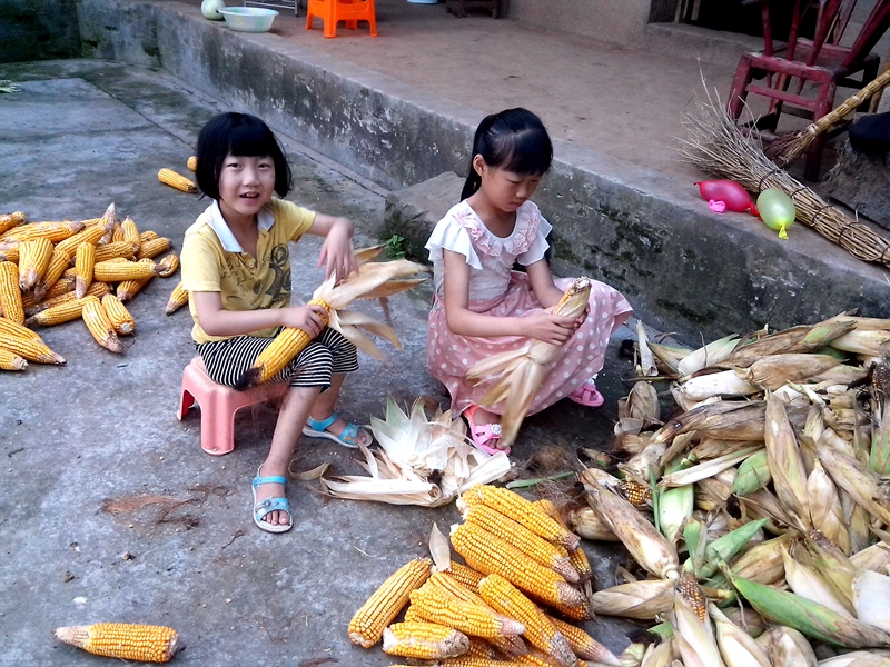 早饭过后,外婆顶着烈日去砍玉米杆子。我和妹妹便开始给玉米剥壳,别以为这是很轻松的事,有的玉米穿得太厚了,非得一层一层地剥不可,一两下是弄不好的。妹妹坐不住,不一会儿就跟其他小朋友跑出去玩了。我不得不独自一个人把所有的玉米棒子壳皮剥完。最后我还要把它们散开并均匀地晒在院坝里。