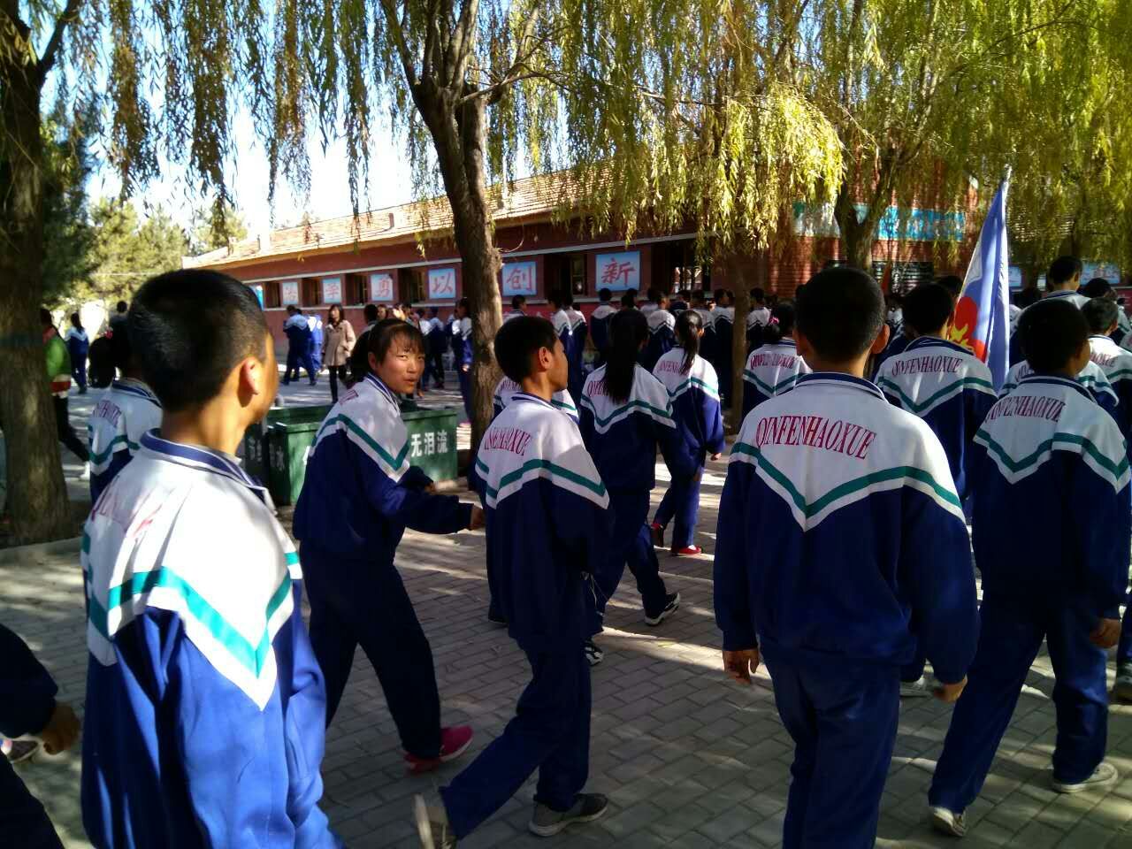 看下面的同学们,排着整齐的队伍,举着自己的队旗,非常认真地听着朱校长的讲话。其实,我们内心早就渴望来这样一场趣味运动会了,因为学习实在太苦燥了,也太辛苦了。我们也盼望有个机会,好好地放松一下。