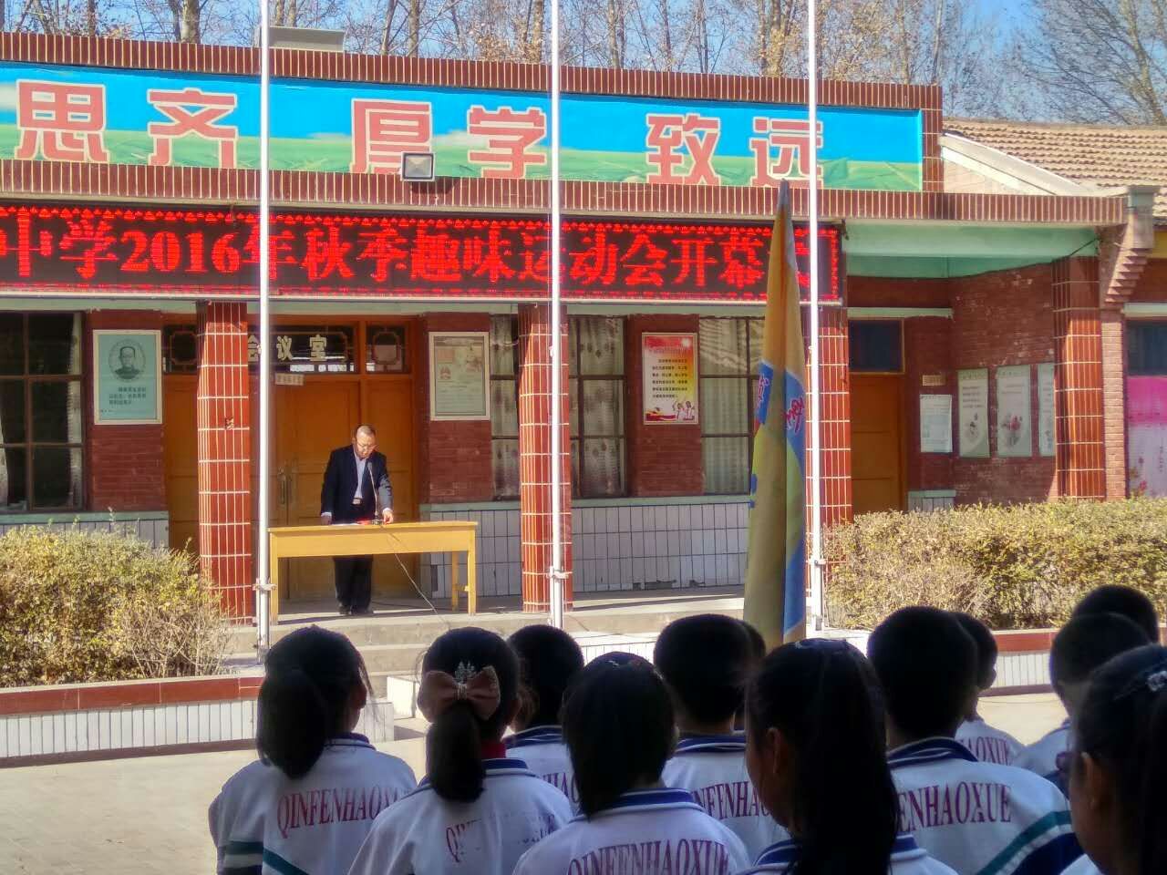 今天早晨,我校举行了秋季趣味运动会的开幕式。开幕式由朱校长主持,朱校长致开幕词,说明了本次趣味运动会不是竞技项目,而是突出了趣味性,调节同学们的学习和生活,增进同学之间的友谊为目的的一次运动会。