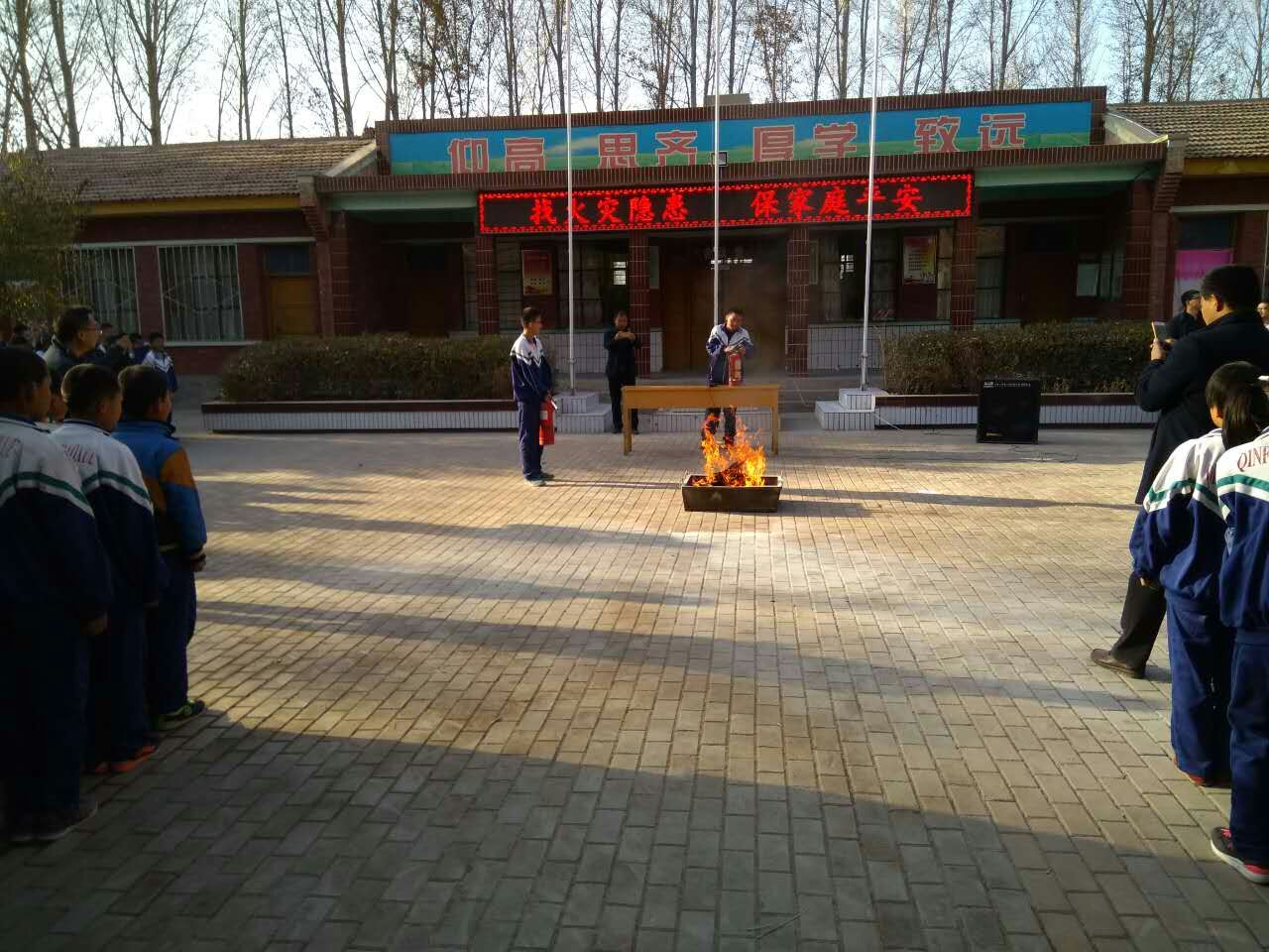我们先来到旗台前,老师们早已准备了火源,消防老师耐心细致地讲解灭火器的使用,同学们没有用过,都感到非常新奇。我们每个人都目不转睛地看着怎么使用这个"新式武器"——灭火器。
