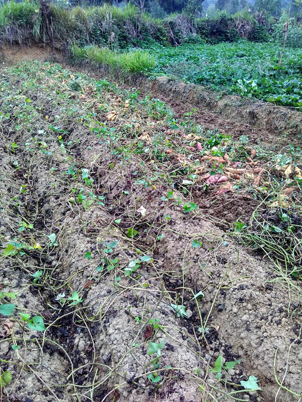 刚到地里时,你就可以看见大片的红薯藤裸露在泥土外面,在泥土上面还有着一些似是红薯枯萎的叶子似的东西,而那一个个的大红薯就藏在下面,似乎好像是很害羞似的。