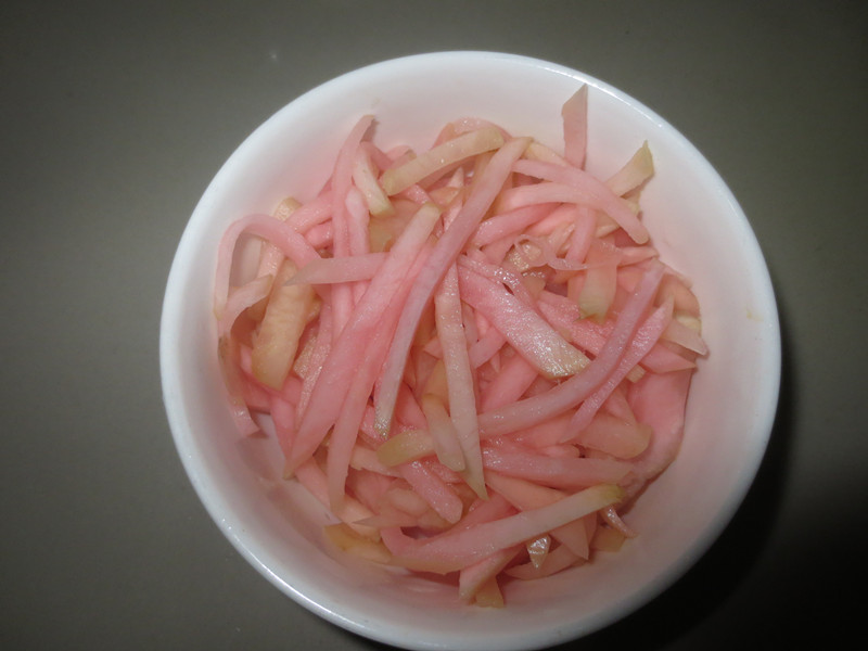 等待了10天左右,终于能尝一尝,我把泡萝卜拿出来,放在案板上,切了一个,装在一个小碗里,配上一碗稀饭,真是美极了!
