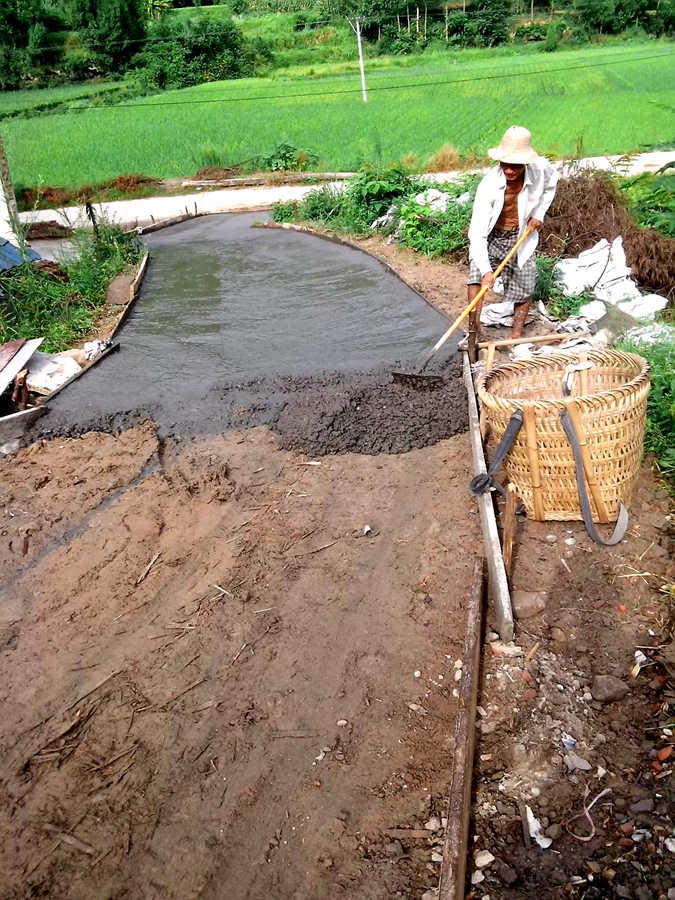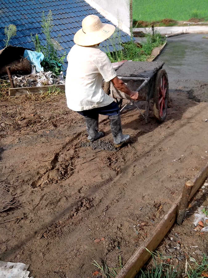 说干就干,大伙儿齐心协力,筹资出力,买回了沙石,搬来了搅拌机,还请了几个工人,也都是乡里乡亲的邻居长辈们,大家住在一起总是相互帮助的。七月的天气十分炎热,火红的太阳似乎就要把大地烤干了,更何况还在修路的长辈们,他们挥汗如雨,汗水湿透了衣衫。他们并没有叫苦叫累,甚至连喝水歇息的工夫都没有。他们有的把沙石一铲一铲的送到搅拌机里,有的则推着满斗车的混凝土跑来跑去的,有的则负责把一堆一堆的混凝土摊开铺平。不管是干哪一项活儿都是非常辛苦的。