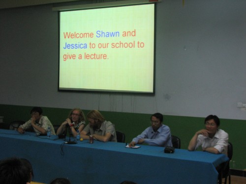 晚上,Mr Shawn and Miss Jessica将给我们讲座,同时和大家交流,阶梯教室里座无虚席,在认真听取了他们的讲话后,一阵热烈的掌声。