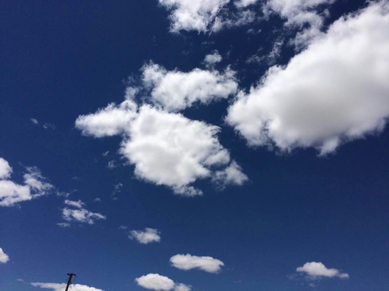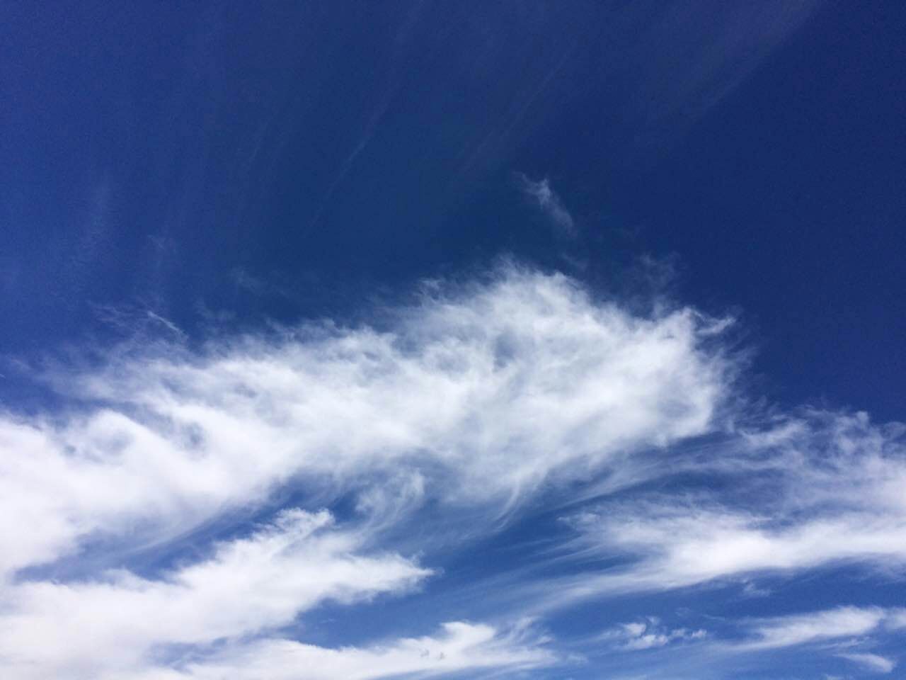 云儿就像棉花一样东一块西一块地散落在深蓝的天空中,又像有人在用手撕开棉花,让棉絮一丝一丝地挂在天空。蓝是深蓝,白是雪白,除了这两种颜色,天空中再无杂色。好美啊。