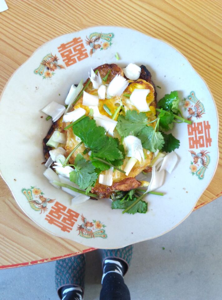 于是我又恢复了信心,往锅里倒入油,又拿了一个鸡蛋打入锅内,等鸡蛋的一面煎的差不多了,用锅铲给鸡蛋翻身,有了上一次的经验,这次也就熟练多了,等两面都煎的差不多了,我才关掉煤气,将鸡蛋铲到盘子里,将一开始就准备好的葱花和香菜撒在上面。呼,终于大功告成了!刚才一直紧张于盘里的鸡蛋,都没有注意到鸡蛋的形象,现在一瞧,也不错嘛!远远望去,盘里的鸡蛋白里透黄,中心仿佛是金黄的太阳。看着看着,我都垂涎三尺了。