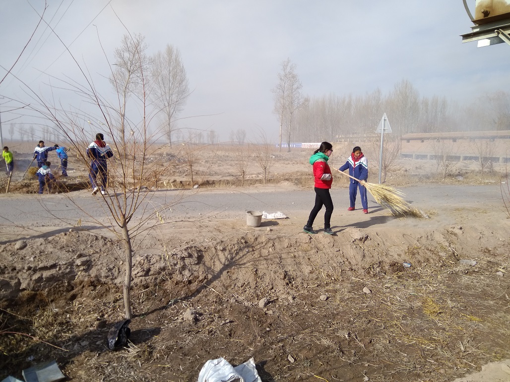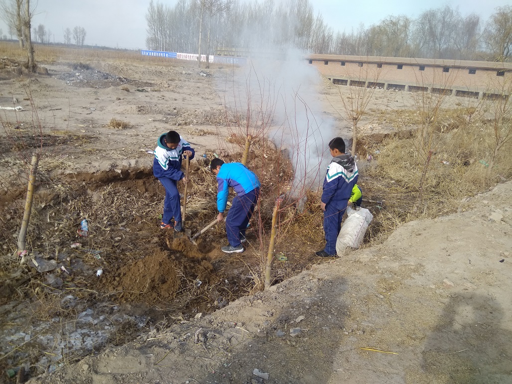 到达指定地点后,老师给同学们分了工,大家争先恐后地拿起扫把和土簸箕,塑料袋干了起来。有的挥舞着大扫把一下一下地扫着散落的垃圾。有的用土簸箕把成堆的脏物装起来集中焚烧,有的拿着大铁锹把枯枝败叶埋在土里,还有的抬垃圾筐倒垃圾。