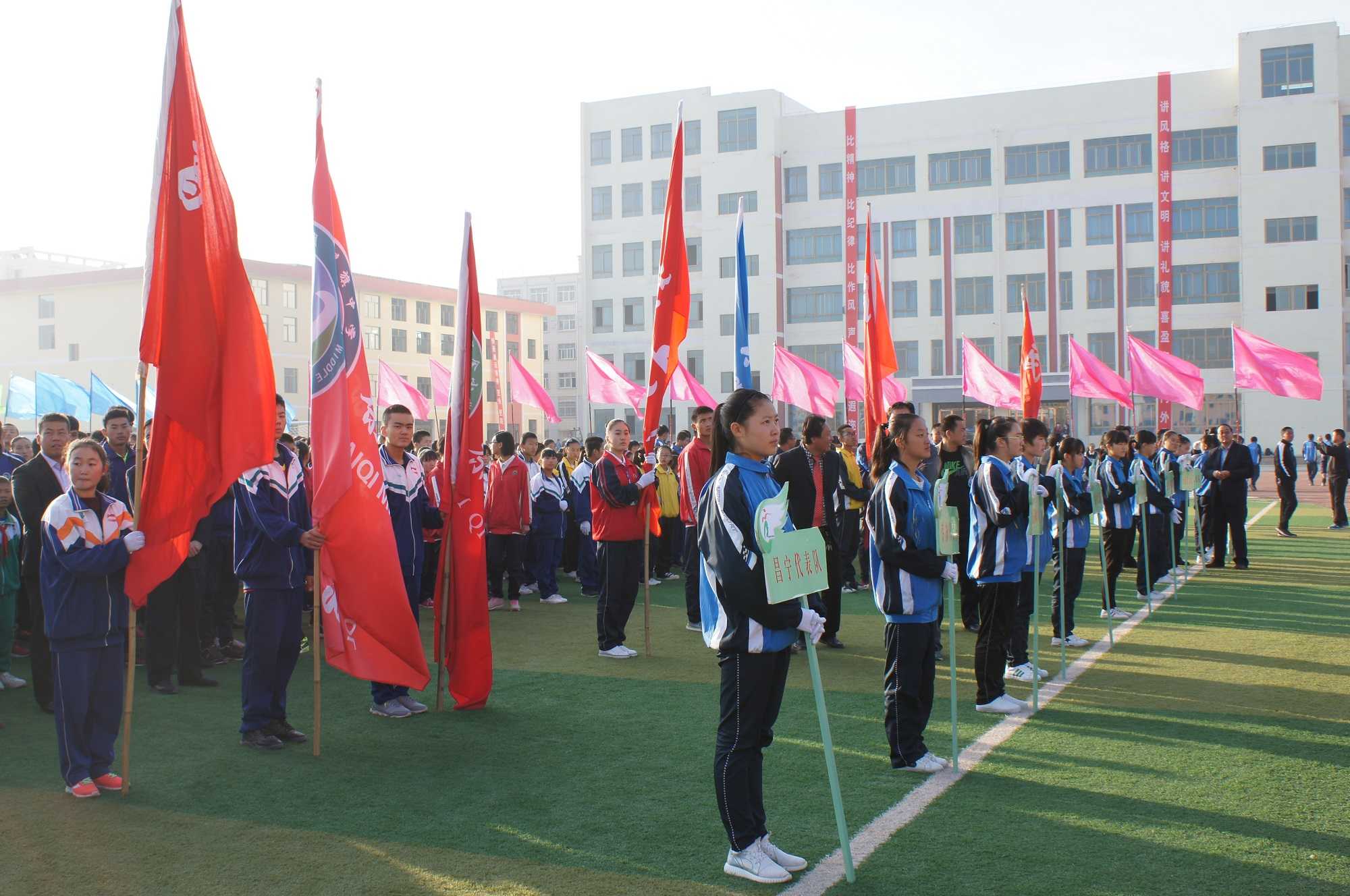 来自各个学校的运动员代表们精神抖擞,随着欢快的鼓点,迈着强健有力的步伐,绕着运动场走了几圈,展示着他们的青春风采。嘹亮的口号声在运动场上此起彼伏,欢庆的锣鼓声响彻云霄。这一切都让我们感到兴奋异常。