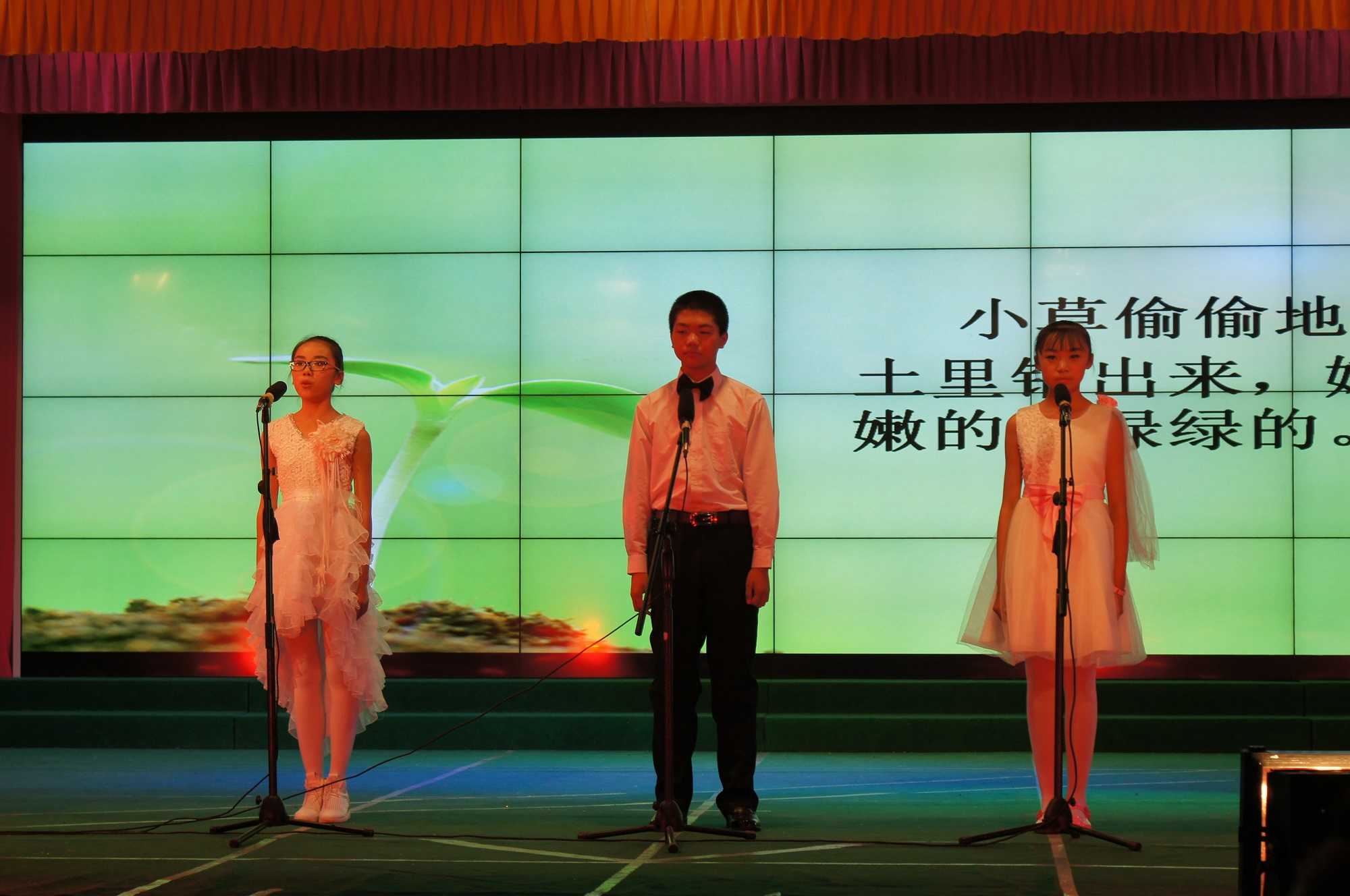 比赛中有的选手所朗诵的篇目是来自语文课本的,他们声情并茂的读着"小草偷偷地从土地里钻出来,嫩嫩的,绿绿的。园子里,田野里,瞧去,一大片一大片满是的。"让我们仿佛感受到了春天的气息。