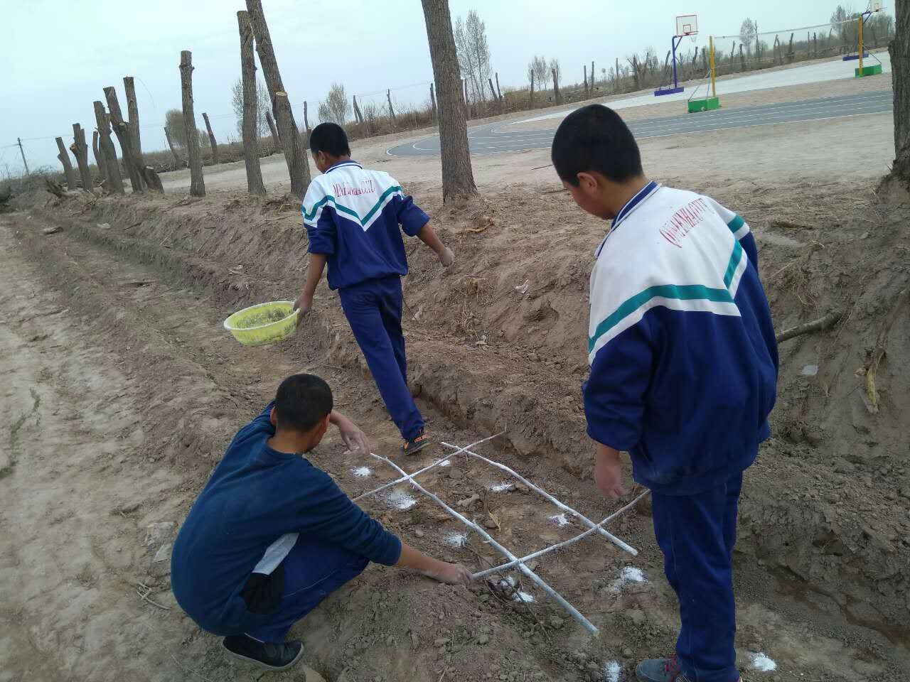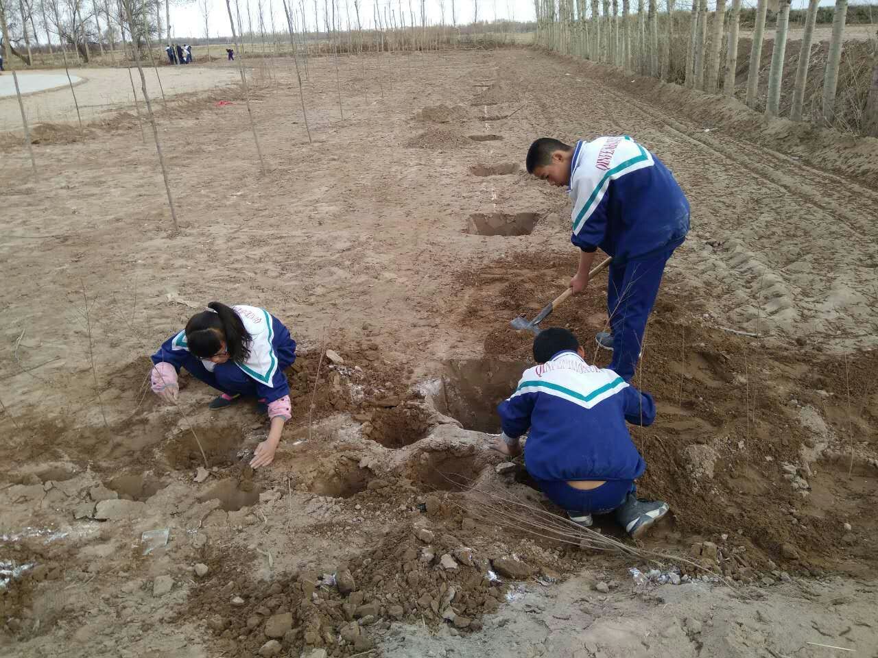 先是挖了一条长长的宽沟,然后,几个男生,用他们学习的数学知识,进行等距离的打点。每一个白点就对应一个树坑,在那里要栽上一棵树呢!