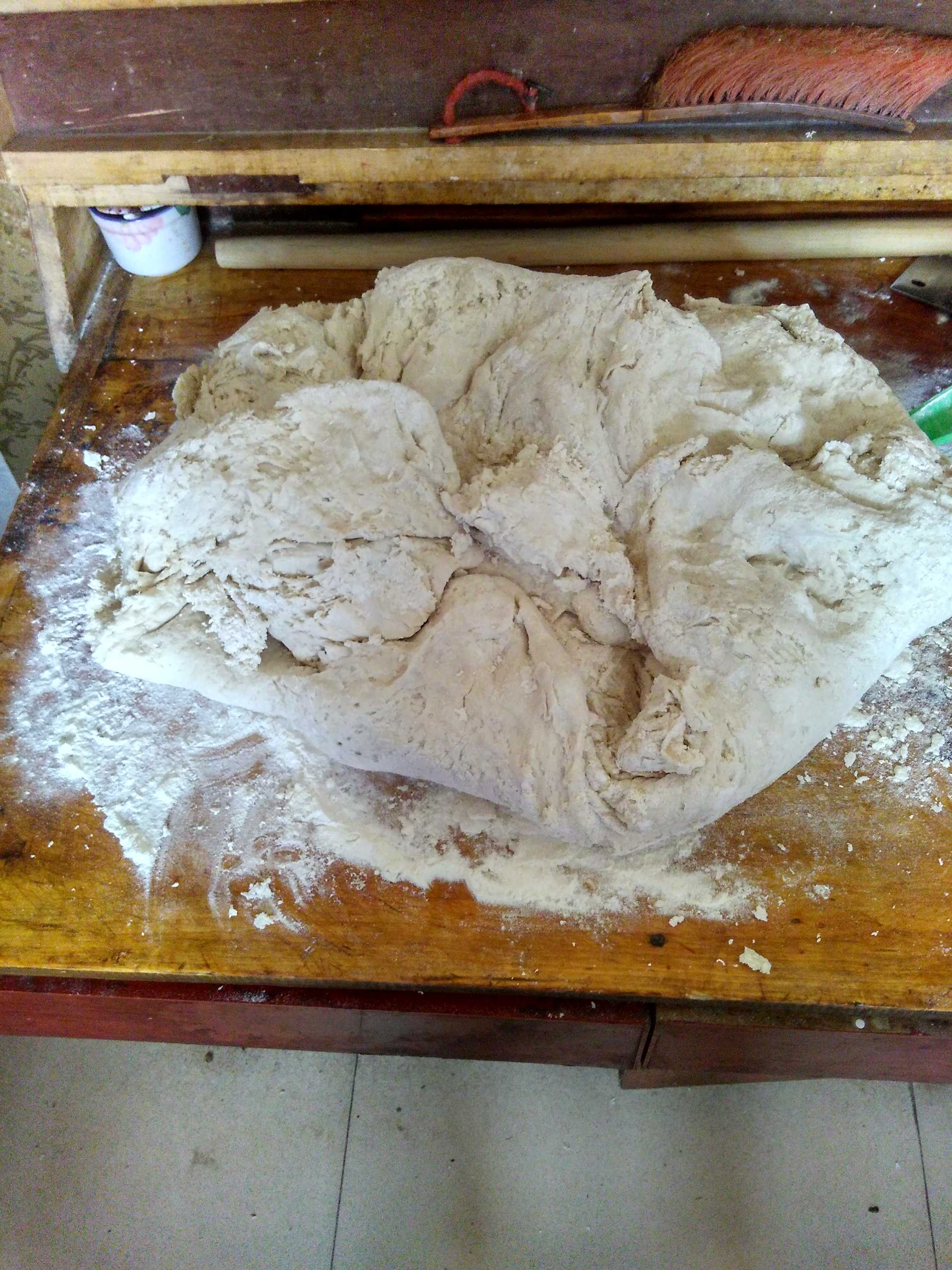 馕馍馍的第一道工序是发面,要根据馍馍的多少和面。为了使馍馍酥脆可口、富含营养,常常要在面中搅拌上鸡蛋。面多的时候要用几十个鸡蛋,加足了鸡蛋的面团看起来黄灿灿的,可以想象到是多么的美味了。