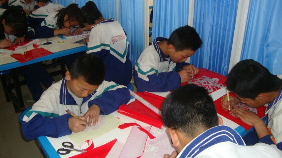 剪纸组的同学们很忙活,他们三个人一组,五个人一伙。有的在细心勾勒、描绘图案,有的在小心翼翼的裁剪。复杂的图案对他们来说是小菜一碟,只见薄薄的字片在他们的手中上下翻飞,一会儿一个个栩栩如生的人物、花鸟就在他们手中成型了。