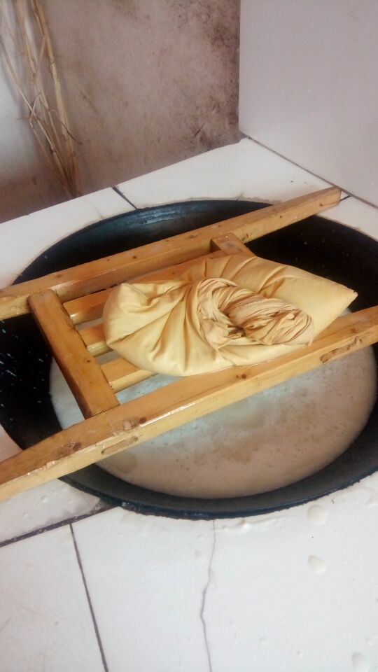 第三步,把打好的豆浆用豆腐袋子把豆浆装起来过滤,不然豆渣跑到锅里就不好吃了,如果你想喝豆浆的话,等豆浆烧开了就可以喝了。豆浆烧开了上面有一层白沫把那个没盛出来,过一会沫就成了豆腐。