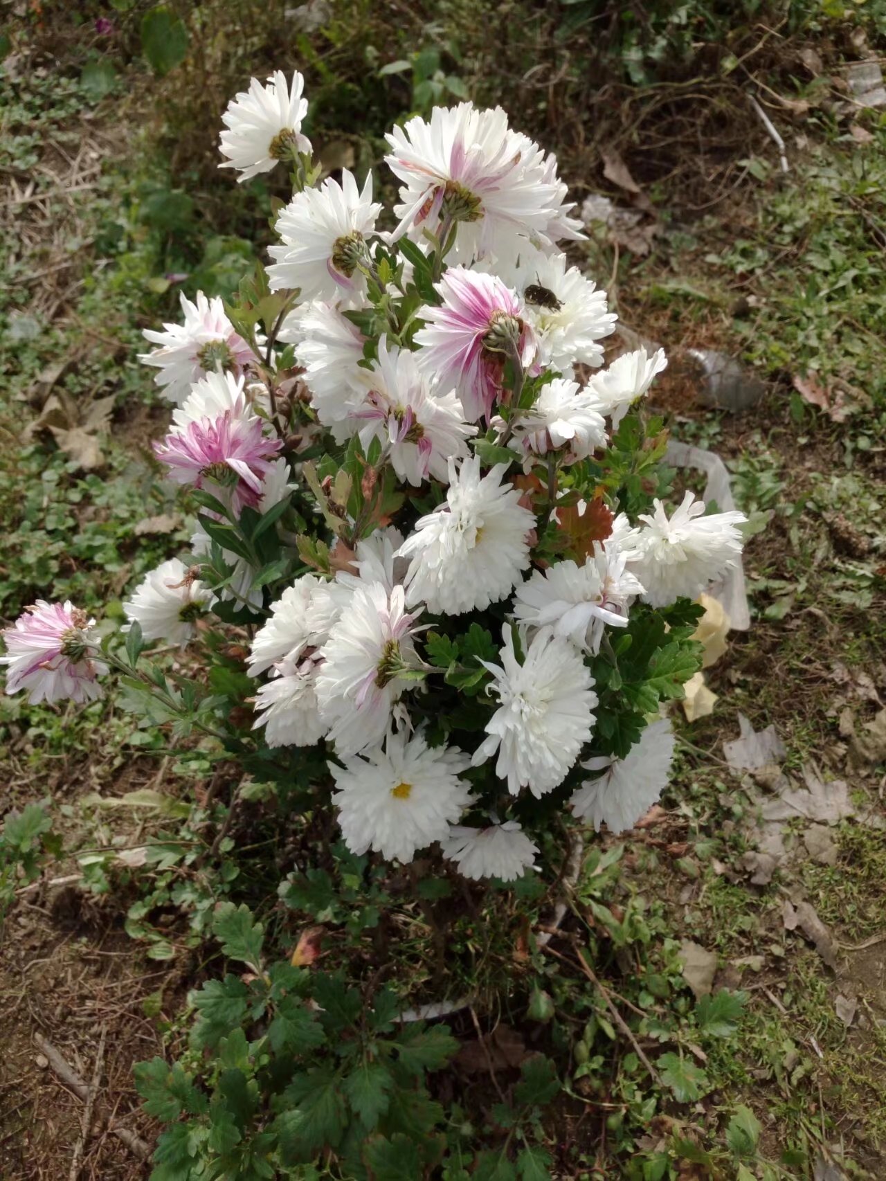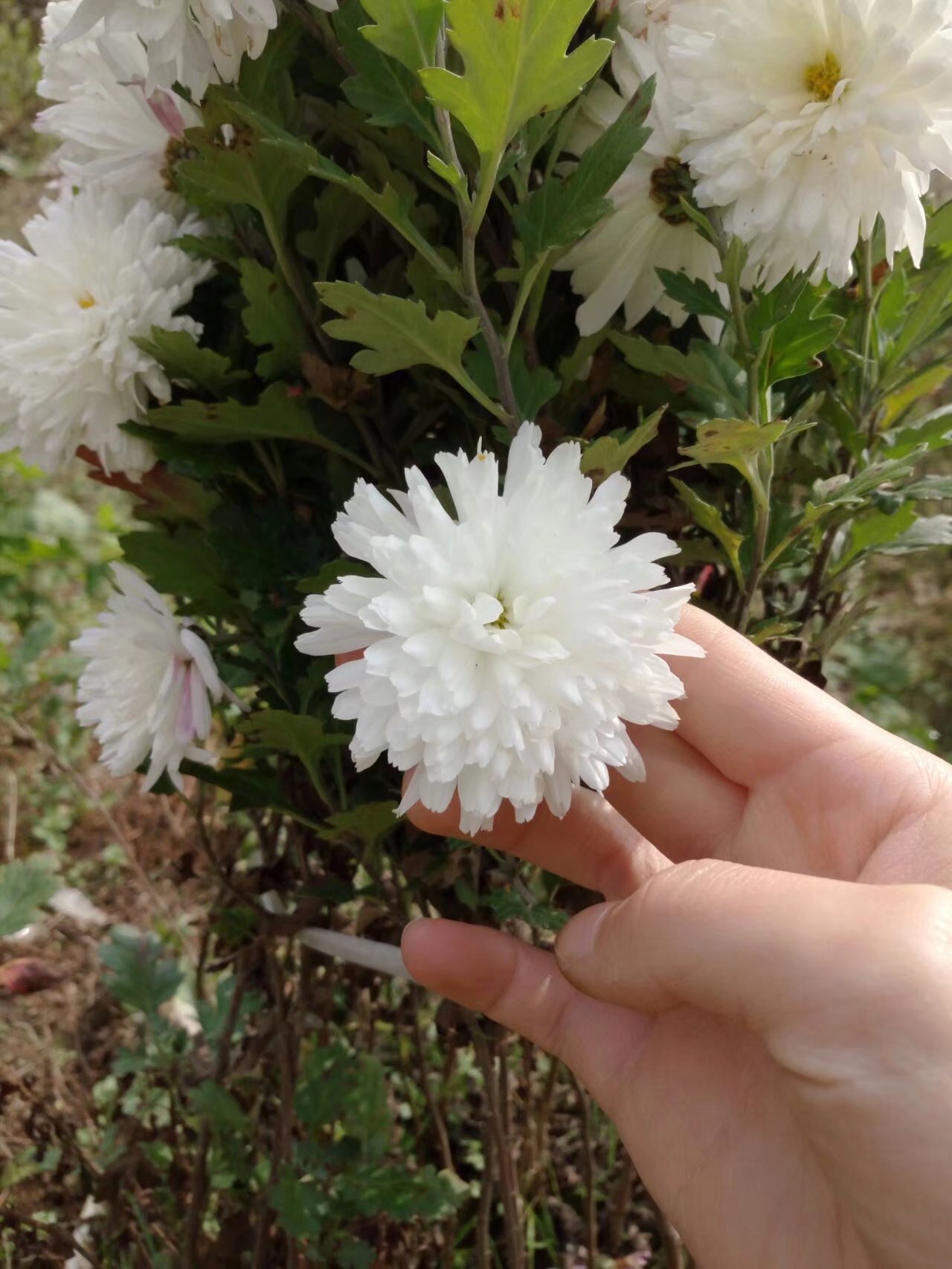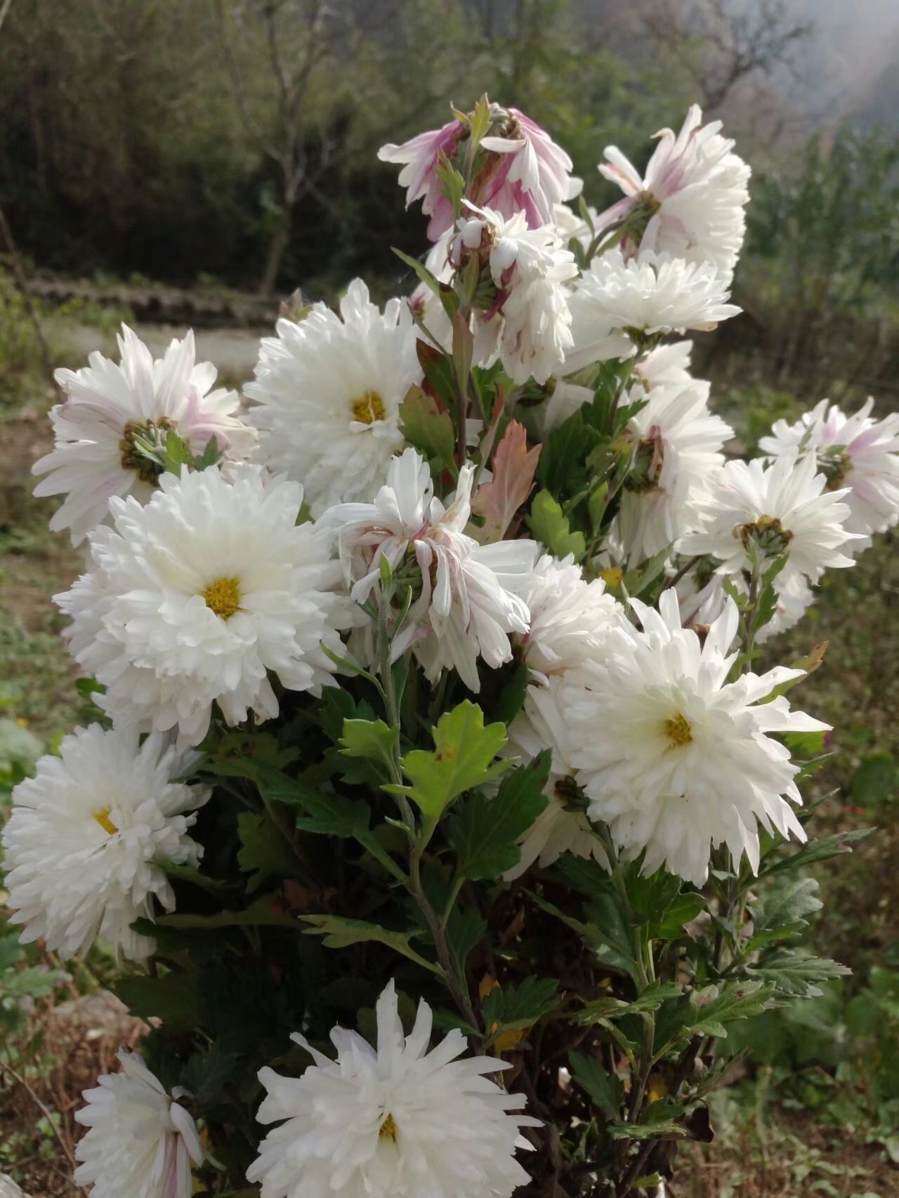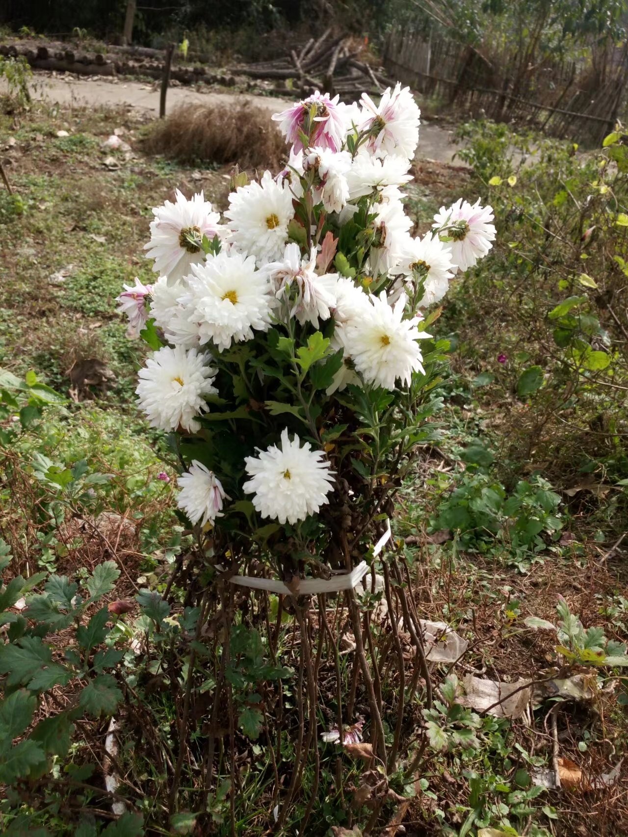前面就是自家的菜地了。远远望去一簇高挑的植物映入眼帘。"都这个时节了,还有什么花儿呢?"我自言自语的说着,疾步走去,想要一探究竟。 走到跟前才发现那是一簇菊花,是白菊花。哪一簇菊花足足有十几根,一根挨着一根。那略深一点的显得十分夺目,花瓣上还零零星星的散落着小露珠。