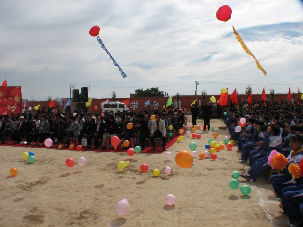 迎风招展的彩旗在蓝天白云的映衬下更显得鲜艳,漫天飞舞的气球如彩蝶般飞向天际。会台上,五颜六色的花朵在这深秋之时反而开得更加妖娆,看台上,每一位观众的脸上都洋溢着喜悦的笑容。这一切仿佛都在渲染着这个特殊的日子——盐池二中五十周年校庆!