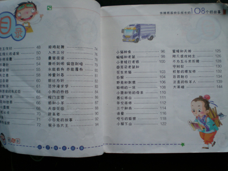 我很喜欢看童话故事书,里面的故事很吸引我。我只有一本故事书,也算是我最喜欢的故事书。它的名字叫《男孩快乐成长的108个好故事》。