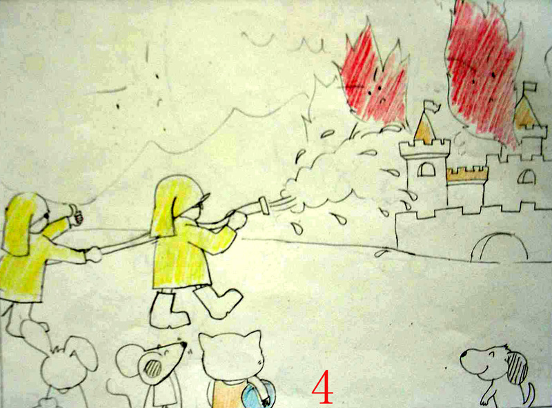 消防叔叔很快就来了,用水枪把火熄灭了。 还好有大家的帮忙,还有消防叔叔的努力没有人受伤, 动物王国里又恢复了往日的欢乐。