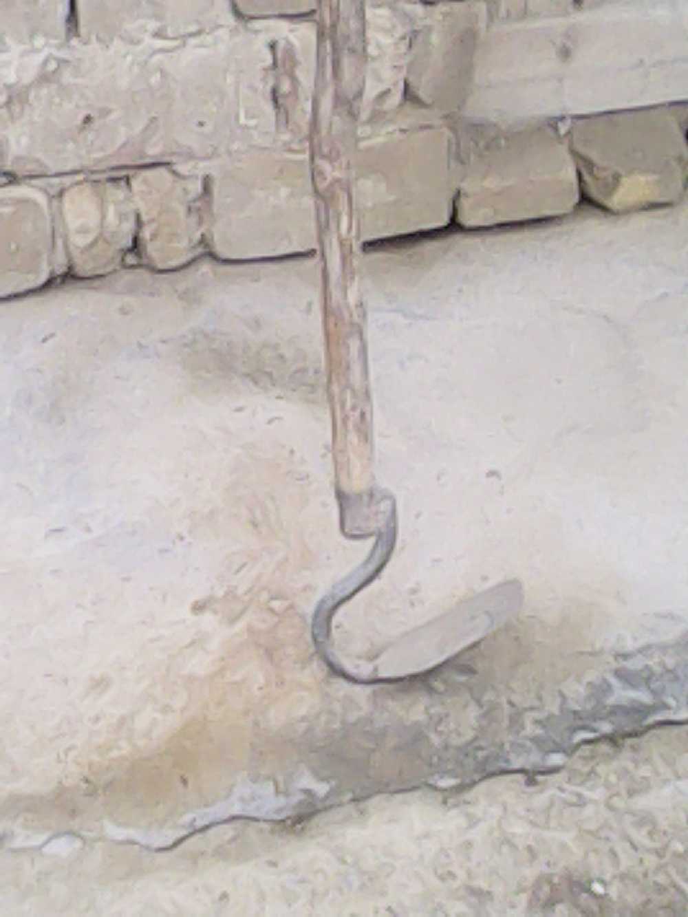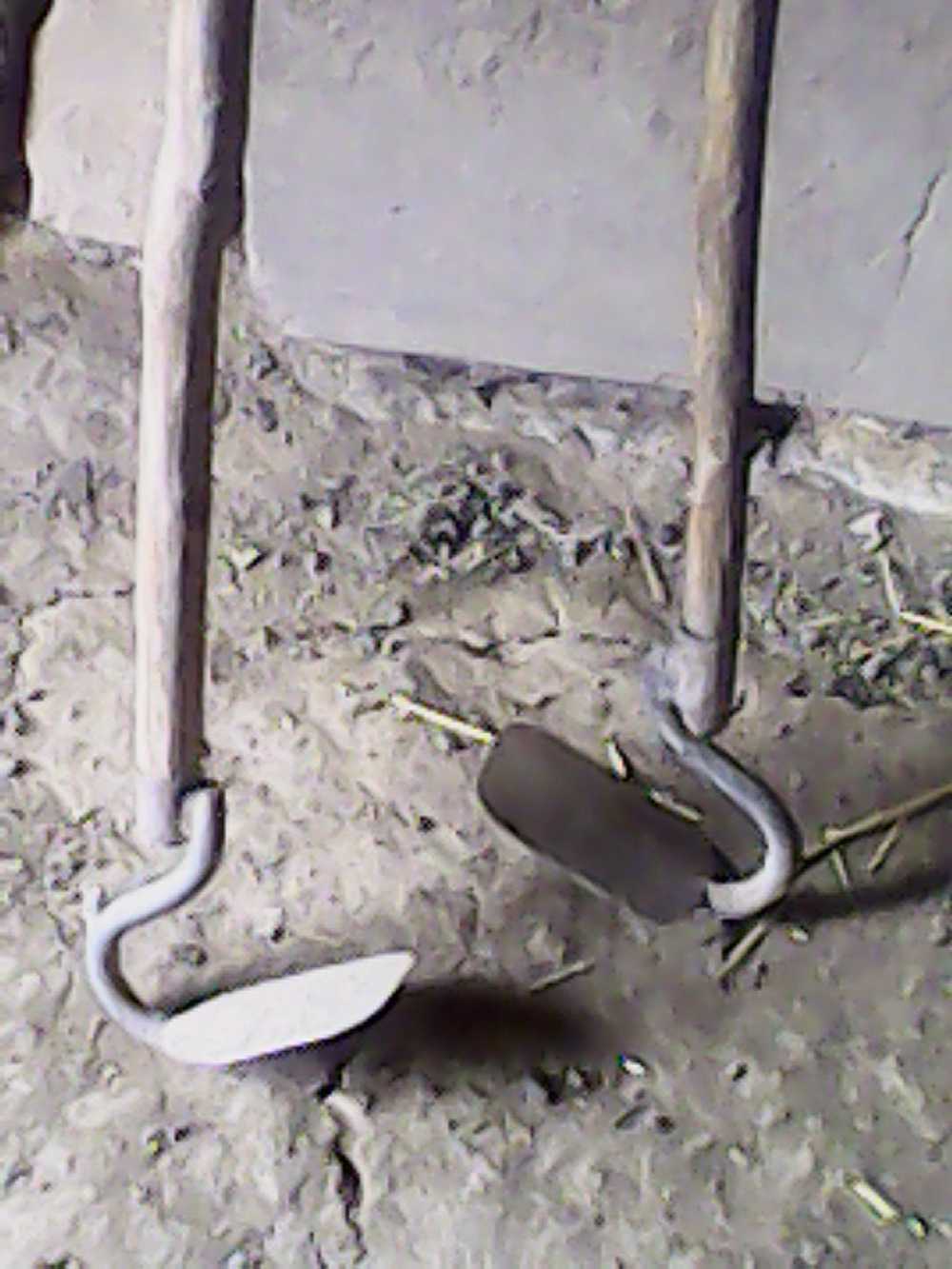 这锄头看起来特别简单,首先它有一个长木棒,这个木棒必须要直直的,在前面是一个用铁做成的锄头,头上有一个孔就和这个木棒连接在一起。这种锄头可分为好多类,有大的、有小的,专门有除草的,也有除土豆的,平时,园子里有草,人们随便拿起来就锄几下。