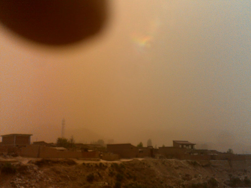 打开门,大风吹得睁不开眼睛。嘴一张,大风就把沙子灌得满嘴碜牙。走到外面,很快就会披上一层黄沙尘土,成了"黄毛女"。我站在崖边,强劲的风几乎能把我吹下去。远处的房屋已看不清,只是黄沙一片。