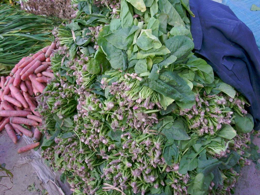 看这么大娘卖的菠菜多新鲜呀,一看就让人有食欲,呆会一定让妈妈买一些回去解馋,还有红艳艳的胡萝卜。