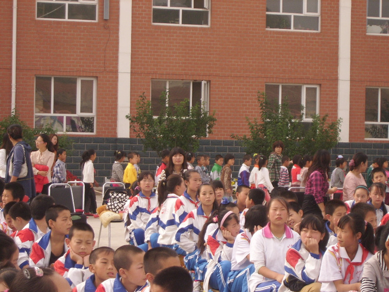 我穿上整洁的校服,戴上鲜艳的红领巾,提着小凳子来到操场上。