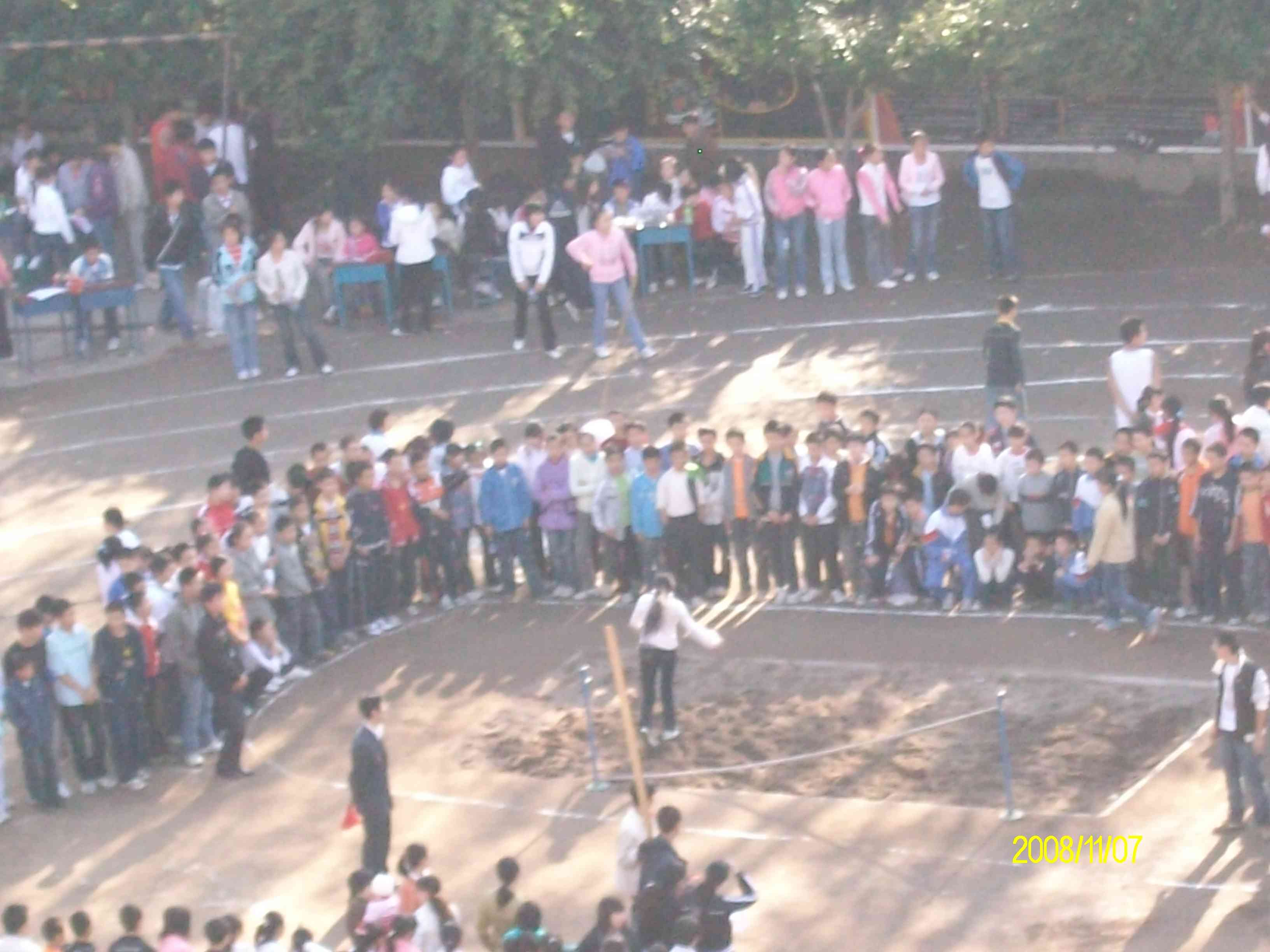 这里是跳高的场地,同学们都很努力地跳着,有的通过了,而有的很不高兴地没有跳过去,可同学们是高兴的,因为他们的运动员参与了。