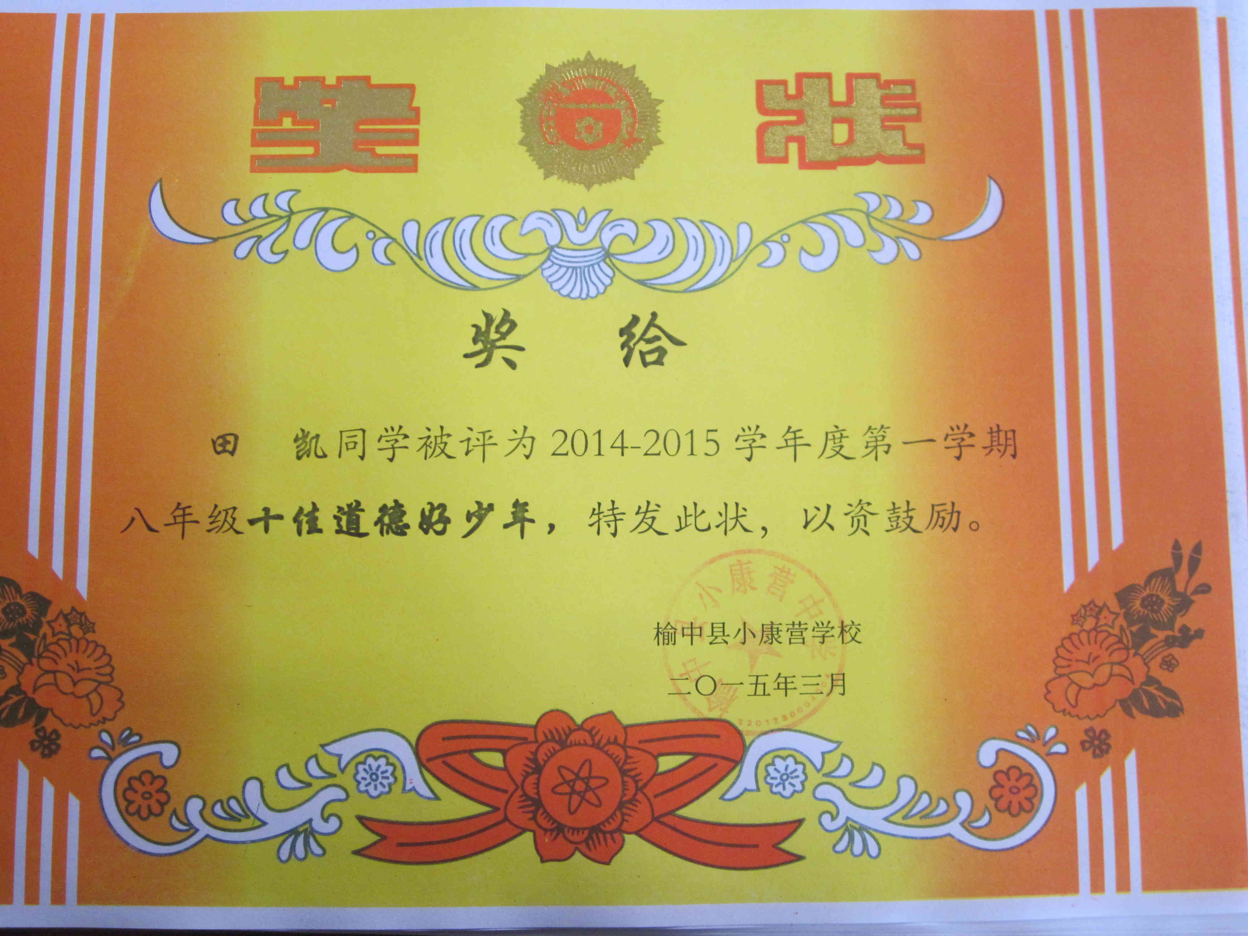 我班田凯获得了“十佳道德好少年”的称号!为他感到骄傲和自豪!我要好好学习,加油,继续努力!向十佳学习!