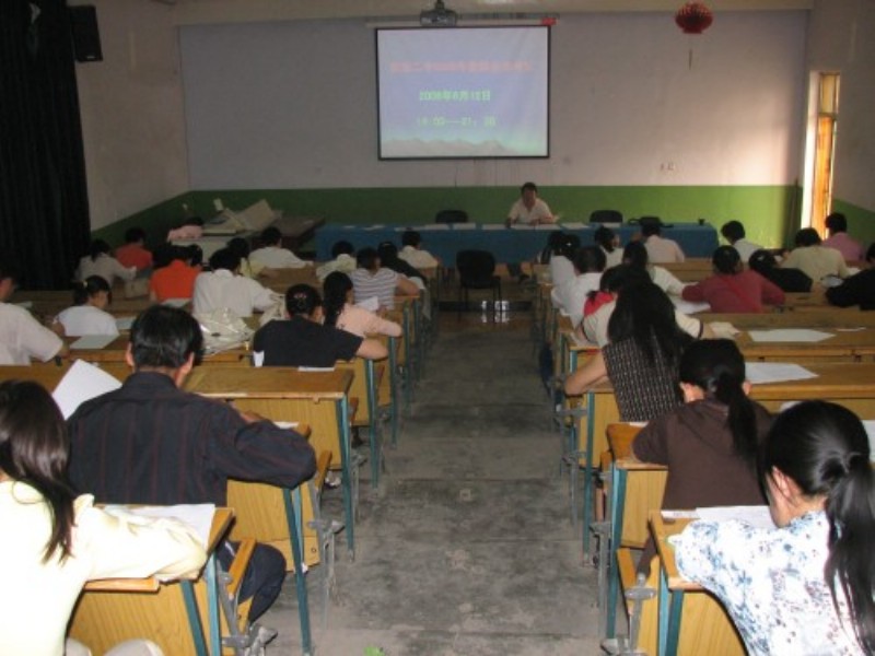 每年的教师业务考试试题是由教研室从银川一些高级中学调来的题,之前进行过严格的保密,各位老师们早已准备答题了,当试卷一发下,教师们都开始认认真真答题了,和我们平时的学生考试同样,考风考纪要求很严,考场设在阶梯教室,考场内一片宁静。