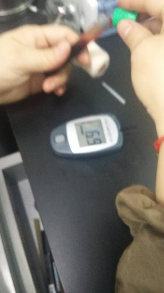 先拿出血糖仪,等一系列的东西,然后对病人拿指针扎进中指等雪流出来在放到测试条里,血糖仪里的数字就是你的血糖。