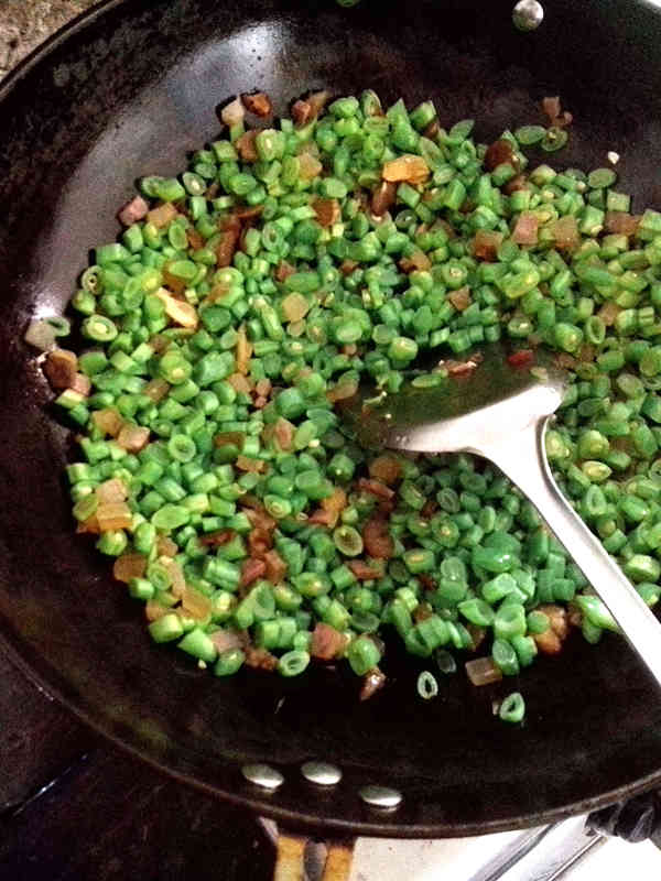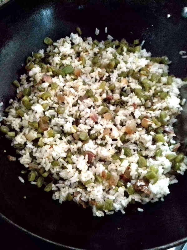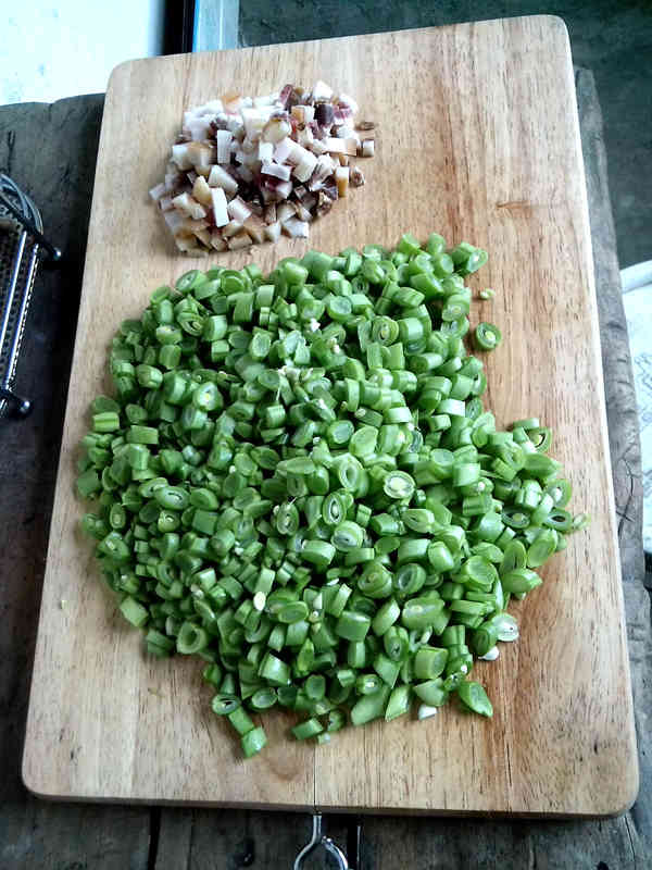 说干就干,先将四季豆捋一下,也就是去掉两头,掐掉菜虫吃掉的部分,再洗干净备用。菜准备好了,我便开始用电饭锅烧水煮饭,同时,我开始把腊肉与菜切碎,我小心翼翼的切,因为一笔小心就会切到手指的。四季豆还简单,可是肉就没有那么轻松了,它们滑滑的非常不听话,费了我九牛二虎之力才把它们全部切碎。一看锅,可以滤饭了,否则米就要被煮化了,而干饭的米要硬一点才好吃的。