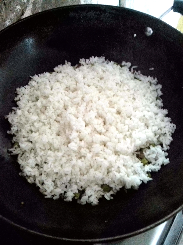 把肉和菜放到锅里稍微炒一下,把味调好,对了,不要忘记加入适量水到菜里面,不然蒸饭的时候会糊的。把滤起来的米倒在菜上面铺均匀,最后盖上锅盖煮一会儿就可以了。这时候火候最关键了,先大火再小火。闻到香味时饭应该就熟了,大约八到十分钟就可以了。