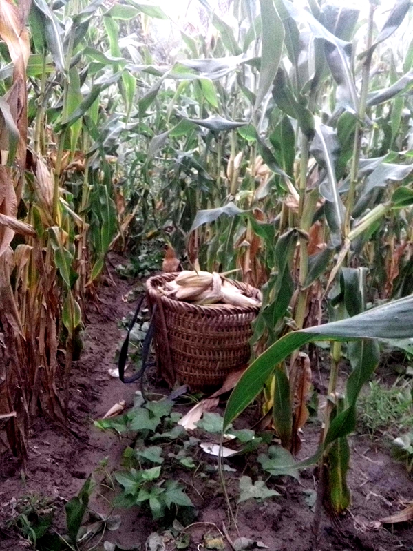 今天一大早我们便出发了,首先要做的就是把玉米棒子连皮从玉米杆上掰下来,将它们放进背篓里。外婆动作十分麻利,就像变魔术一样,我还没反应过来,空空的背篓就变得满满的了。外婆还要一背篓一背篓地把它们背回家去。那些沉甸甸的玉米把她的脊背都压弯了。玉米叶子把我的手也刺得伤痕累累的,可我们边说话边干活,十分开心。不知不觉红彤彤的太阳已经挂在天边了,肚子也开始唱空城计了。整块地的玉米也被掰完了,也该回家吃饭了。