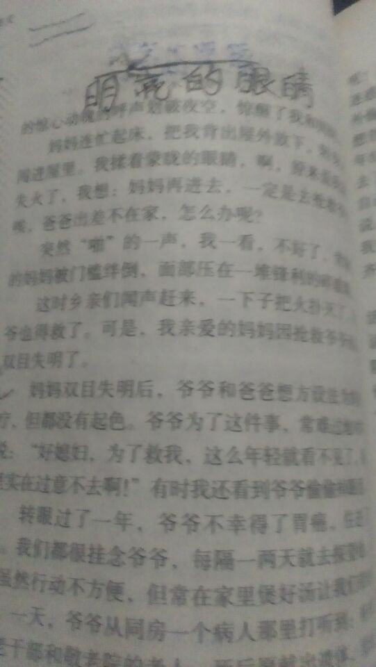 我读过这样一个故事——《明亮的眼睛》。这是一个发生在深夜的故事,"快起来,老王家着火了"......大家被这一阵急促的叫声惊醒了,纷纷跑出家门。大家议论着"这该怎么办,老王一家还在屋里"......是啊,赶紧报警吧!人们赶紧拿起手机拨打火警电话,脸上都显出焦虑和恐慌。火势越来越大,凶猛的火露出了狰狞的面目,浓烟呛醒了正在睡梦中的妈妈,妈妈赶紧抱起"我"往外跑,人们看见妈妈背着个人从火中跑出来时都展开了紧皱的眉头,笑了起来,"太好了,得救了。"大家高兴地说着。刚把"我"放下妈妈又冲进了家中。大家的心再一次提悬了,都说:"好不容易从死神手中逃脱了,还去那么危险的地方干嘛?"过了一会妈妈又背着爷爷出来,出来时被门槛绊倒,眼睛被地上的玻璃刮伤,从此失明了。但妈妈总说她不后悔。