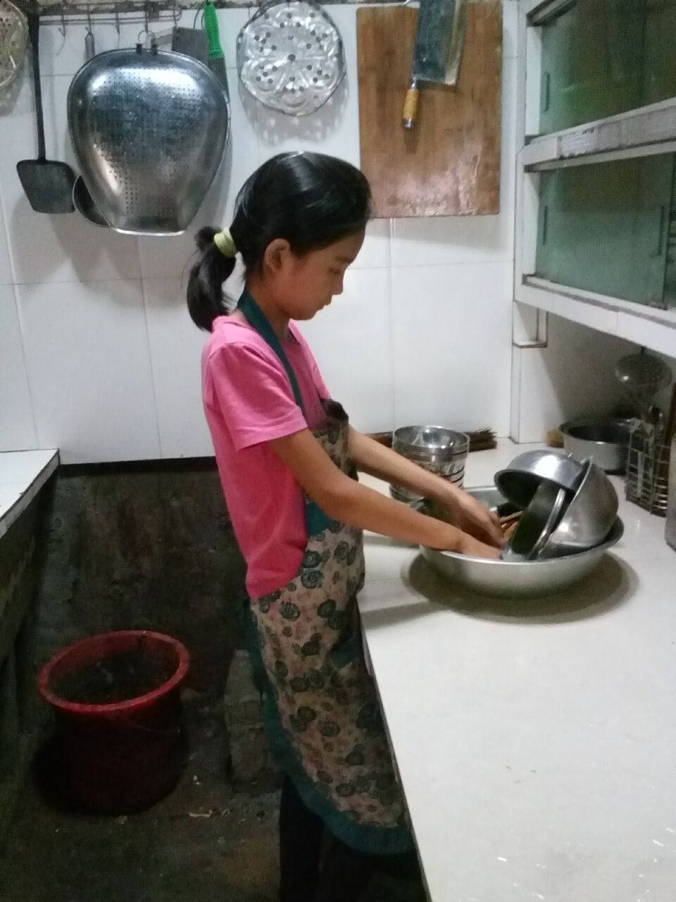 她还喜欢干活,特别是洗碗。几乎每天的碗都是她洗,她先热了热水,再挤两下洗洁精,把碗放进去拿一根白亮亮的帕子,就开洗了。她边洗还边唱歌,好像很开心,我一点也不喜欢洗碗,觉得洗碗烦人,都不知道她为什么那么喜欢洗碗。