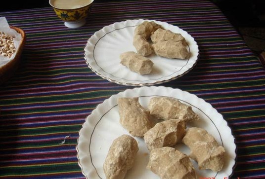 糌粑是藏族的主食。藏族人一日三餐都有糌粑。“糌粑”是炒面的藏语译音,它是藏族人民天天必吃的主食。糌粑的制作方法是,将青稞(属大麦类,有白色、紫黑色二种)晒干炒熟、磨细、不过筛,这样制成的炒面便是可以食用的糌粑了。然后把糌粑放在碗里,加点酥油茶,用水不断搅匀,直到把糌粑捏成团为止(粑就是成团的意思。)而且糌粑还可以做成甜的或者是咸的,只要在倒酥油茶时直接加入就行了。而且糌粑携带方便,适于牧民生活。出门只要带上木碗、腰束、“唐古”(糌粑口袋),再找一点茶水就行了,不必起灶用火做饭。还可在糌粑里加入一些肉、野菜之类,做成“稀饭”,藏语叫“土巴”。糌粑与我国北方的炒面有点相似,但北方的炒面是先磨后炒,而西藏的糌粑却是先炒后磨,不除皮。吃糌粑时,碗里放上一些酥油,冲入茶水,加点糌粑面,用手不断搅匀。