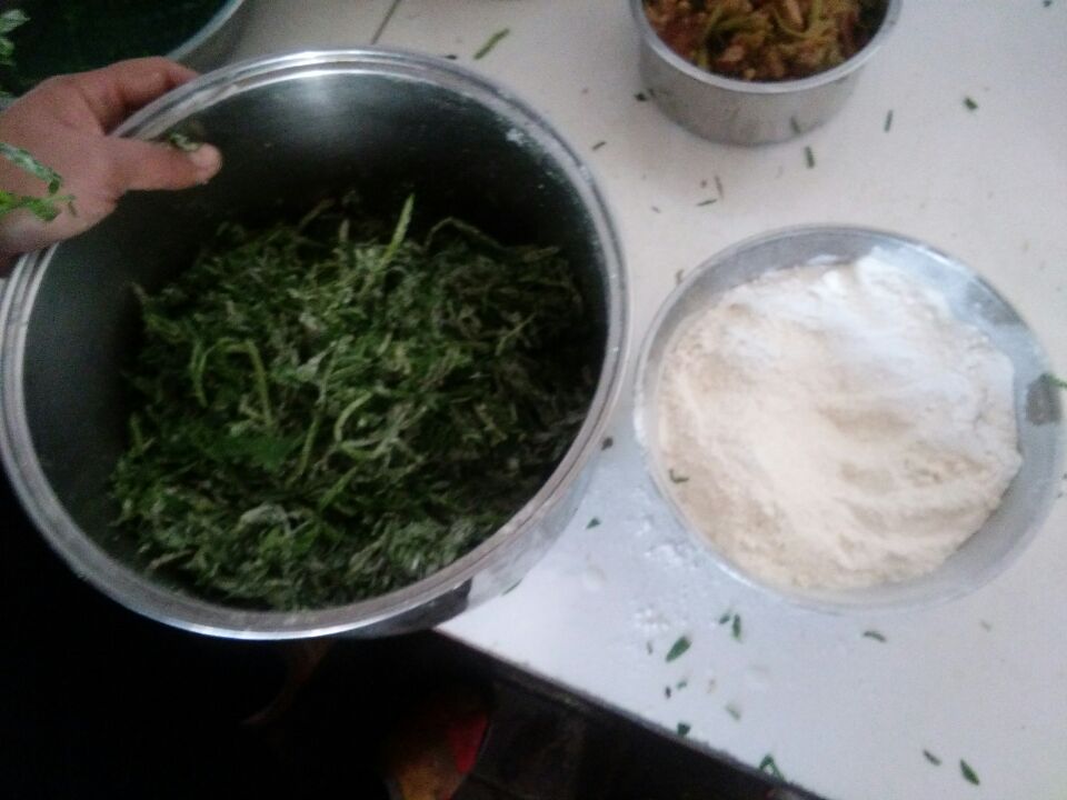 我们把选择好的苕芽在水里淘洗干净。接下来我们要把食盐、花椒粉、面粉和苕芽加水搅拌在一起。要注意的是面粉和水两者要按一定的比例放,不然或是太稀或是太干,就捏不到一起去了。