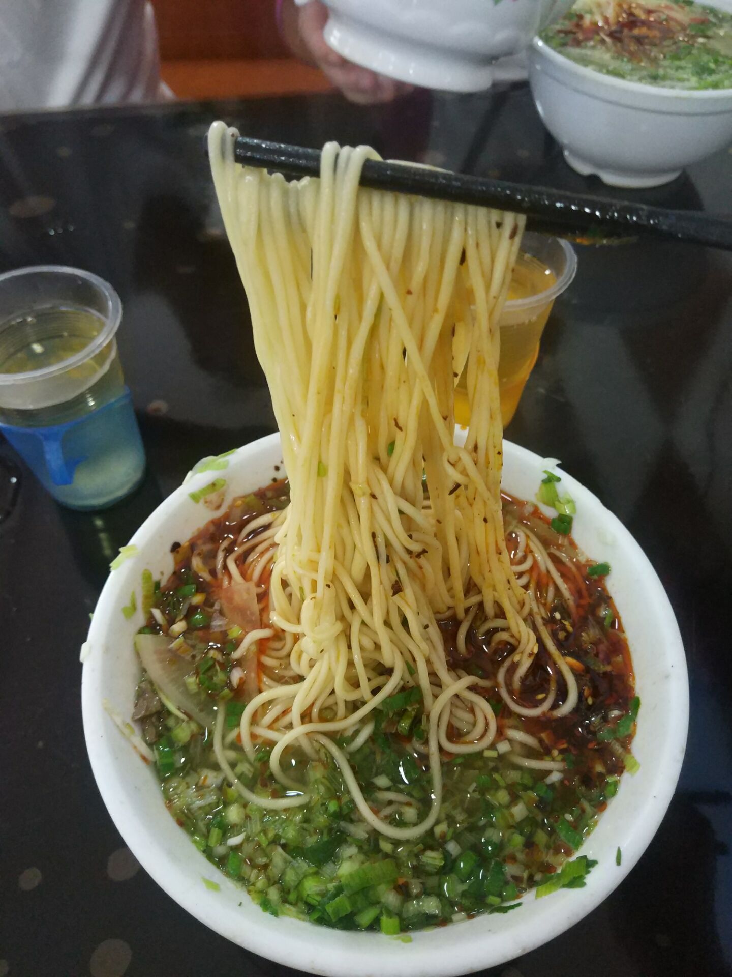 兰州牛肉面,除了那独特的味道,出名的更是拉面师傅的拉面。一个面团,双手在两头一扯,将面在面板上摔长,发出"咚咚"的声响,手一挽,面霎时间"变"为两条,一变二、二变四、四变八......那动作说行云流水也不为过,那手在空中只留下一道残影,疾如雷电讯如风,快若箭拔,像上下翻飞的蝴蝶,面条也随着拉面师傅手上的动作变换......不知道的人,还以为拉面师傅在做什么厉害的"法术",让人叹为观止,但实际上只是拉碗面罢了。最后,拉面师傅的双手不断抖动着,将面条拉的更匀称,面条上下翻飞,如同大海上的浪花。面条细如发丝,却不断、不粘、有嚼头,又爽口。看拉面师傅拉面,像欣赏一出杂技。不,这出"戏、杂技"演员不可能演的出。