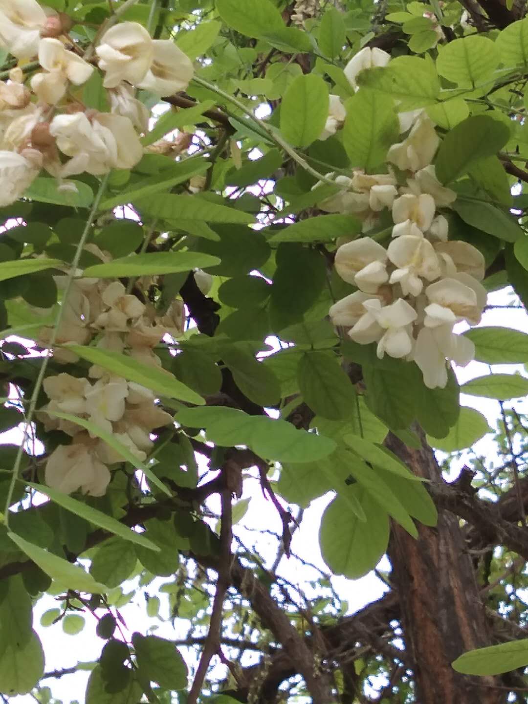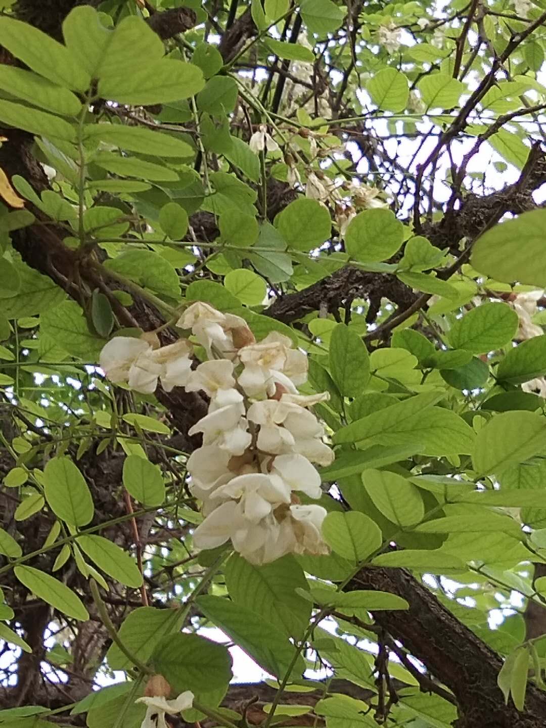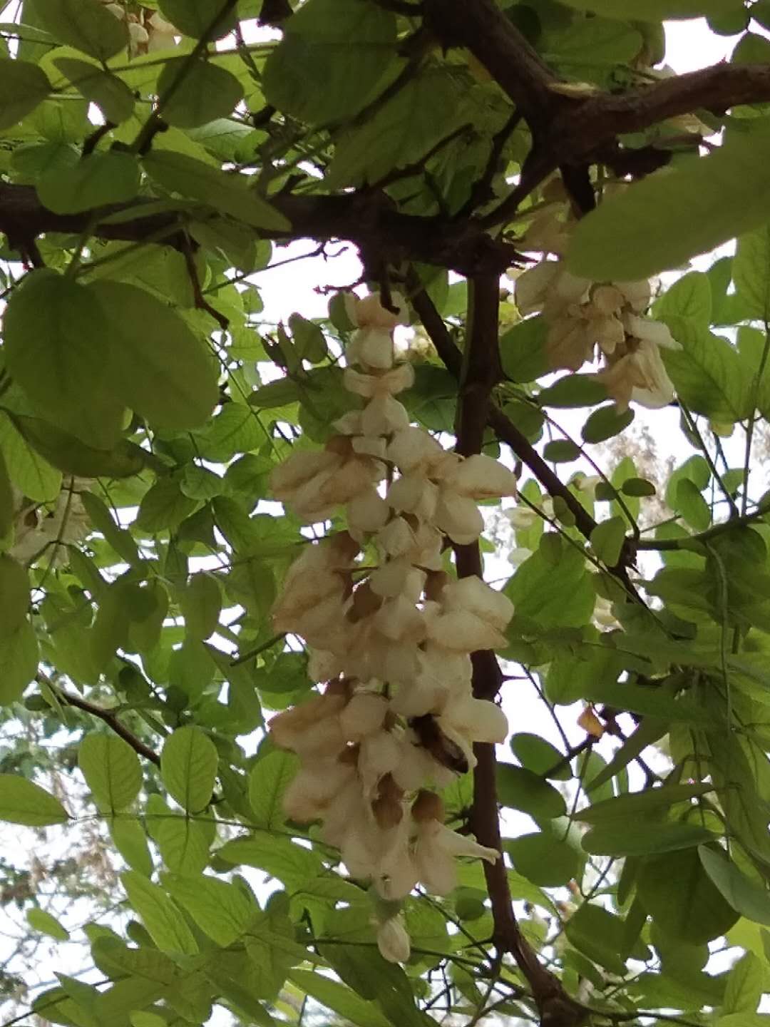 走在乡间的小路上,鸟儿们叽喳的歌唱着,春的气息迎面而来, 雨后泥土所溢出的芳香,油菜花所飘来的清香,嗯,深吸一口气,淡淡的幽香,熟悉的气味,俺的嗅觉总是比俺那双近视眼获取信息的速度要快上几分,顺着这奇特的香味,我发现了好几颗上了年纪的槐花树。人间四月芳菲尽,"道旁槐花"始盛开。他们长着大雨伞似的遮盖,枝干上上有郁郁葱葱的叶子,一串串白里透黄的槐花挂在枝梢上,远看就像是颗颗珍珠,走进瞧,像是一只只呼之欲飞的白蝴蝶儿。枝繁叶茂的槐花树就像是一个天然屏障,坐在树下憩息,取下一朵便可直接放入口中而食,清凉,爽口,真是惬意啊。
