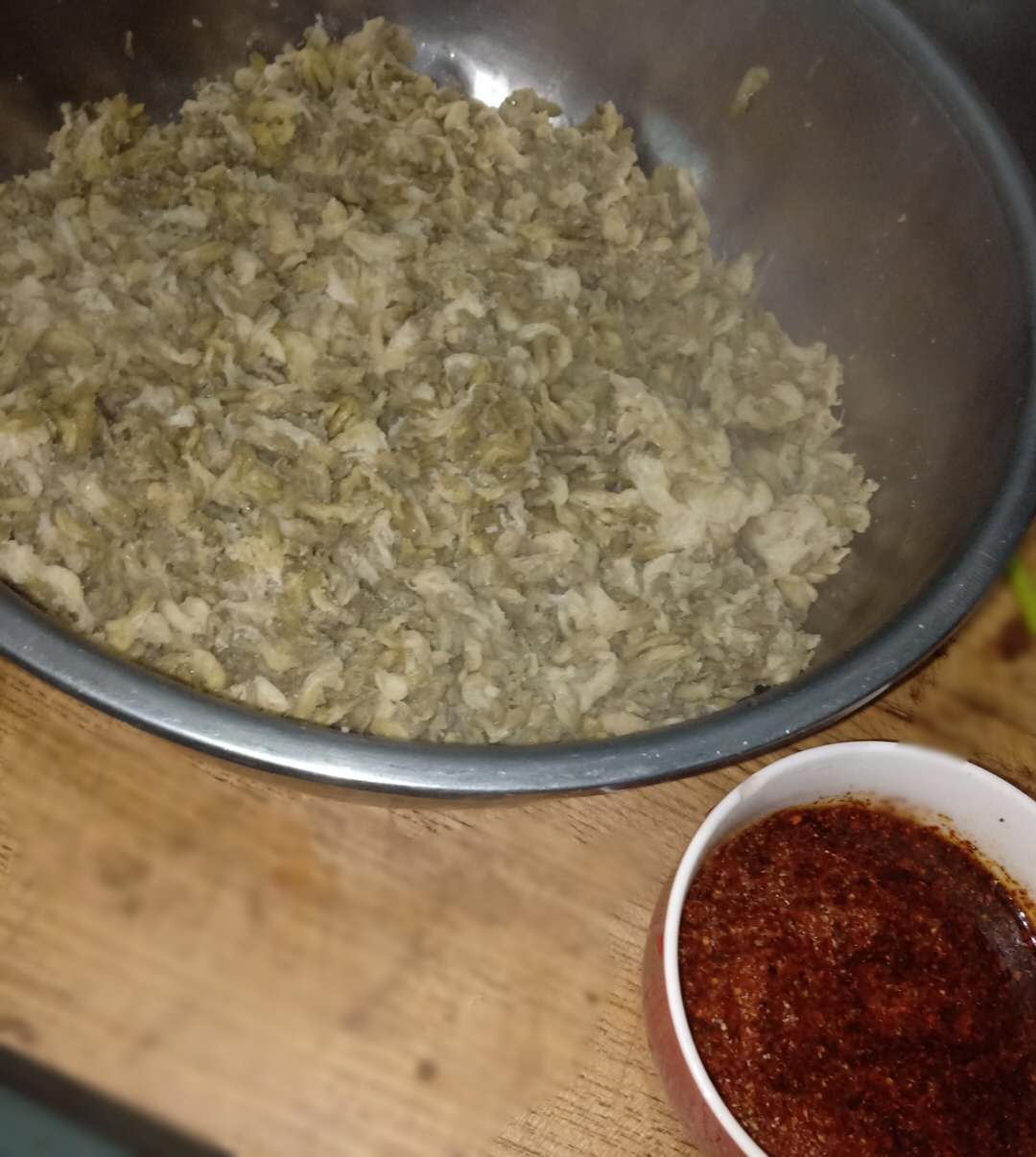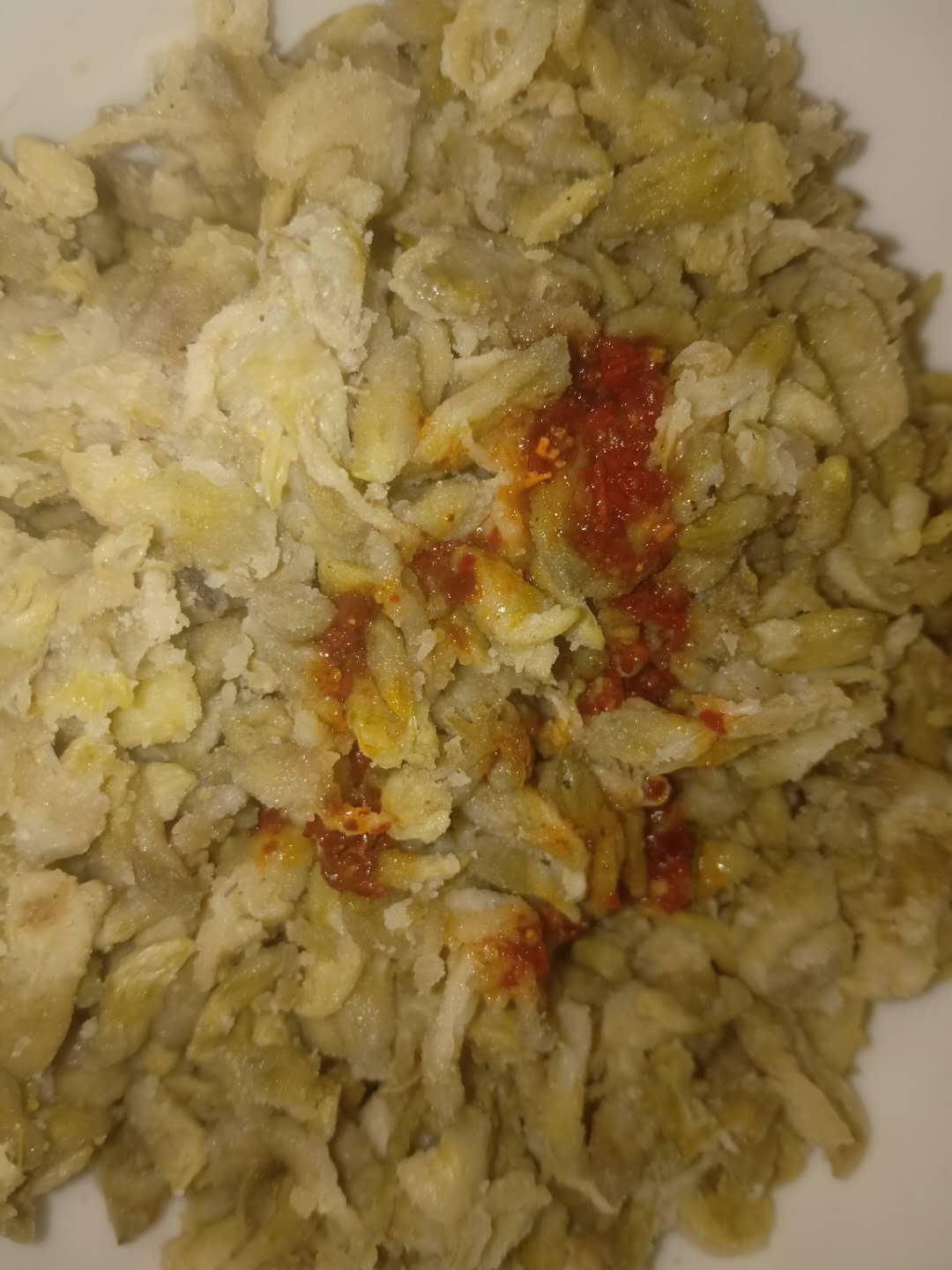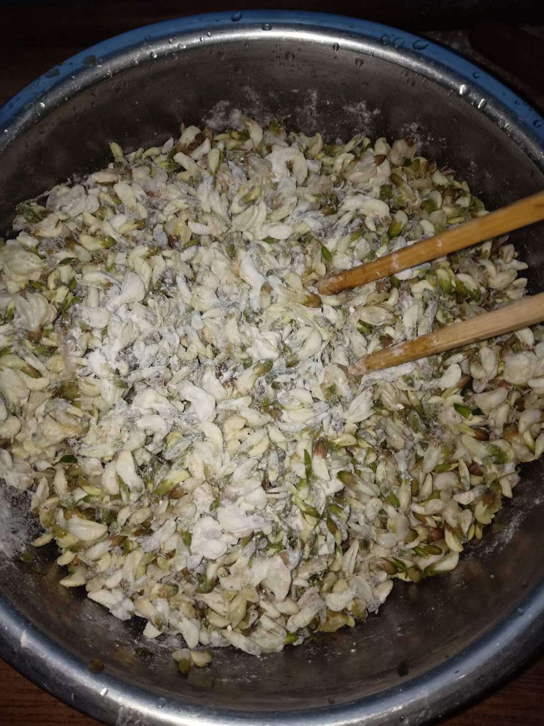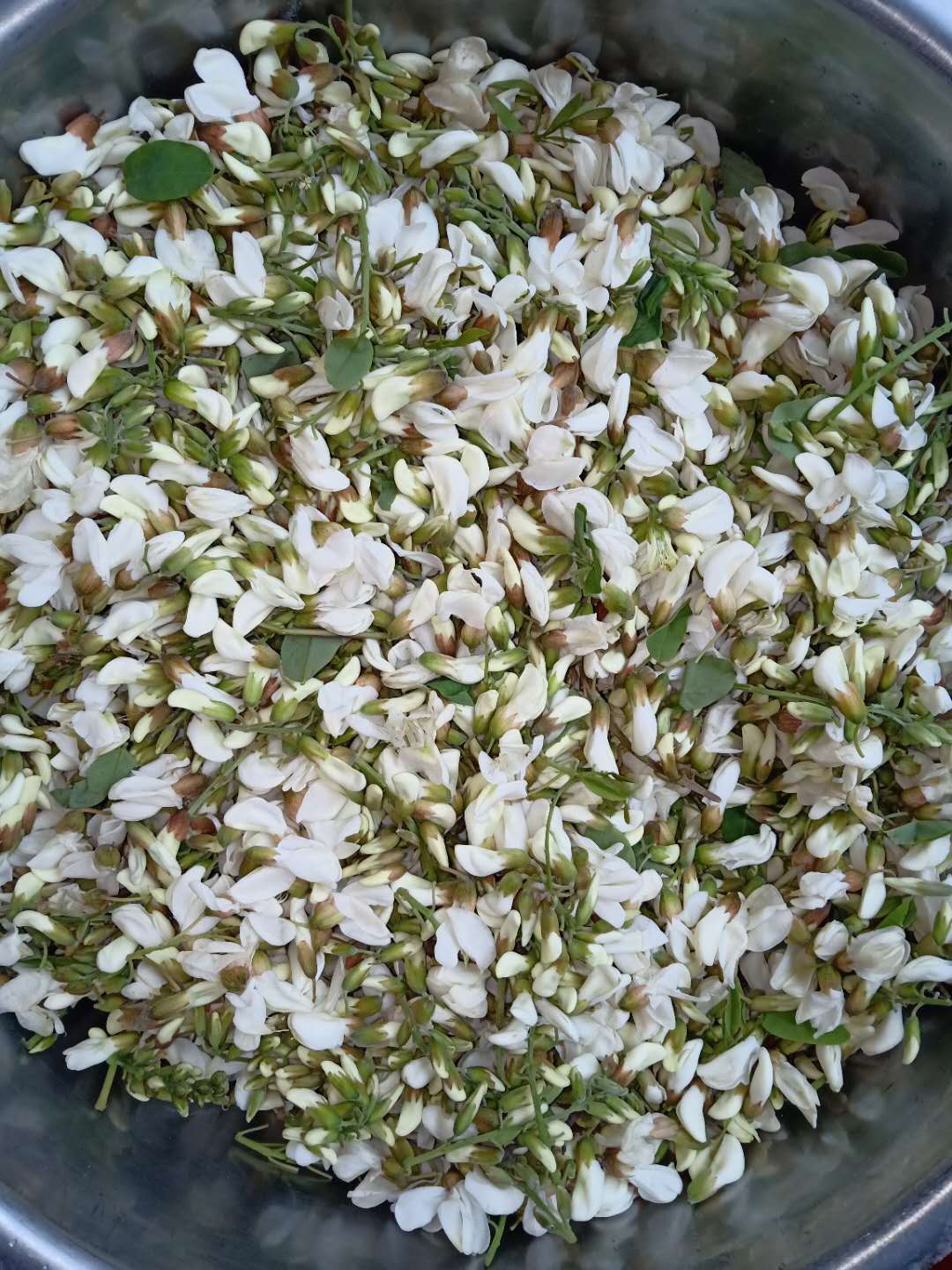 往前再走,发现有好几家人在采摘槐花,我们就加入了他们。爸爸个最高,伸手便可摘到,而弟弟一蹦一蹦的样子,实在是可爱极了。爸爸摘,我和妈妈在下面接。低处的摘的差不多了,要想摘高处的就要用竹竿了,可我们又没有工具,办法总比困难多,使出最接地气的方法——爬树。不用说,这种何等威风的事情,当然是由我老弟完成了,忙活了许久,终于把我们的小袋子装满了,妈妈说差不多一斤多吧,够我们一家子人吃了,满载而归,回到家,我和弟弟早就迫不及待了,开始帮妈妈打下手,择菜,将绿叶挑出来,这一步可谓是"说起来容易做起来难",费了好大功夫才将绿叶捡了出来。妈妈要做我们最爱吃的槐花麦饭了。择完菜就是淘洗,然后将水控干。剩下的就是技术活了,只见妈妈将一丁点儿碱面,一小勺盐,两勺食用油洒在槐花上,用筷子搅匀,然后又倒入一小碗面粉,搅拌均匀,这一步一定要拿握好力度,直到面粉差不多均匀的分散在槐花上面,一块采摘槐花的阿姨还告诉我们在拌面的同时可以拌上肉末,上笼屉隔水蒸,水开后再蒸15分钟,妈妈让我看着表,蒸的时间过短则半生不熟,虽说这槐花可以生吃,但是这生面粉就不能保证安全进入到你的肚子里了;蒸的时间过长则口感不佳,有一种粘糊的感觉。时间到,出锅,最后一步,吃法就多了,泼上煎油,清香可口啊,再配上家常小菜。如果你喜欢吃辣,也可以调上辣汁,那叫个香啊。这槐花不仅是个美味的食材,还有清热泻火、凉血止血、抗炎的功效。